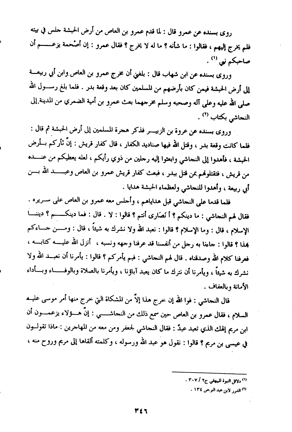 وروى بسنده عن عروة بن الزبير فذكر هجرة المسلمين إلى أرض الحبشة ثم قال: فلما كانت وقعة بدر، وقتل الله فيها صناديد الكفار، قال كفار قريش: إنّ ثأركم بأرض الحبشة، فأهدوا إلى النجاشي وابعثوا إليه رجلين من ذوي رأيكم، لعله يعطيكم من عنده من قريش، فتقتلونهم بمن قتل ببدر، فبعث كفار قريش عمرو بن العاص وعبد الله بن أبى ربيعة، وأهدوا للنجاشي ولعظماء الحبشة هدايا.