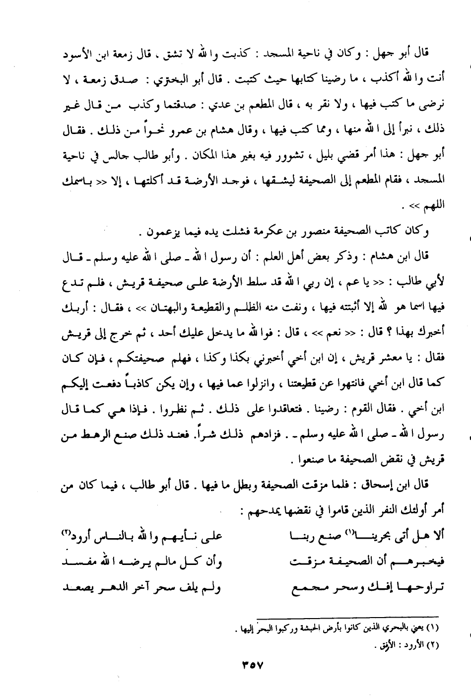 قال أبو جهل: وكان في ناحية المسجد: كذبت والله لا تشق، قال زمعة ابن الأسود أنت والله أكذب، ما رضينا كتابها حيث كتبت. قال أبو البختري: صدق زمعة، لا نرضى ما كتب فيها، ولا نقر به، قال المطعم بن عدي: صدقتما وكذب من قال غير ذلك، نبرأ إلى الله منها، ومما كتب فيها، وقال هشام بن عمرو نحوًا من ذلك. فقال أبو جهل: هذا أمر قضي بليل، تشوور فيه بغير هذا المكان. وأبو طالب جالس في ناحية المسجد، فقام المطعم إلى الصحيفة ليشقها، فوجد الأرضة قد أكلتها، إلا "باسمك اللَّهم".