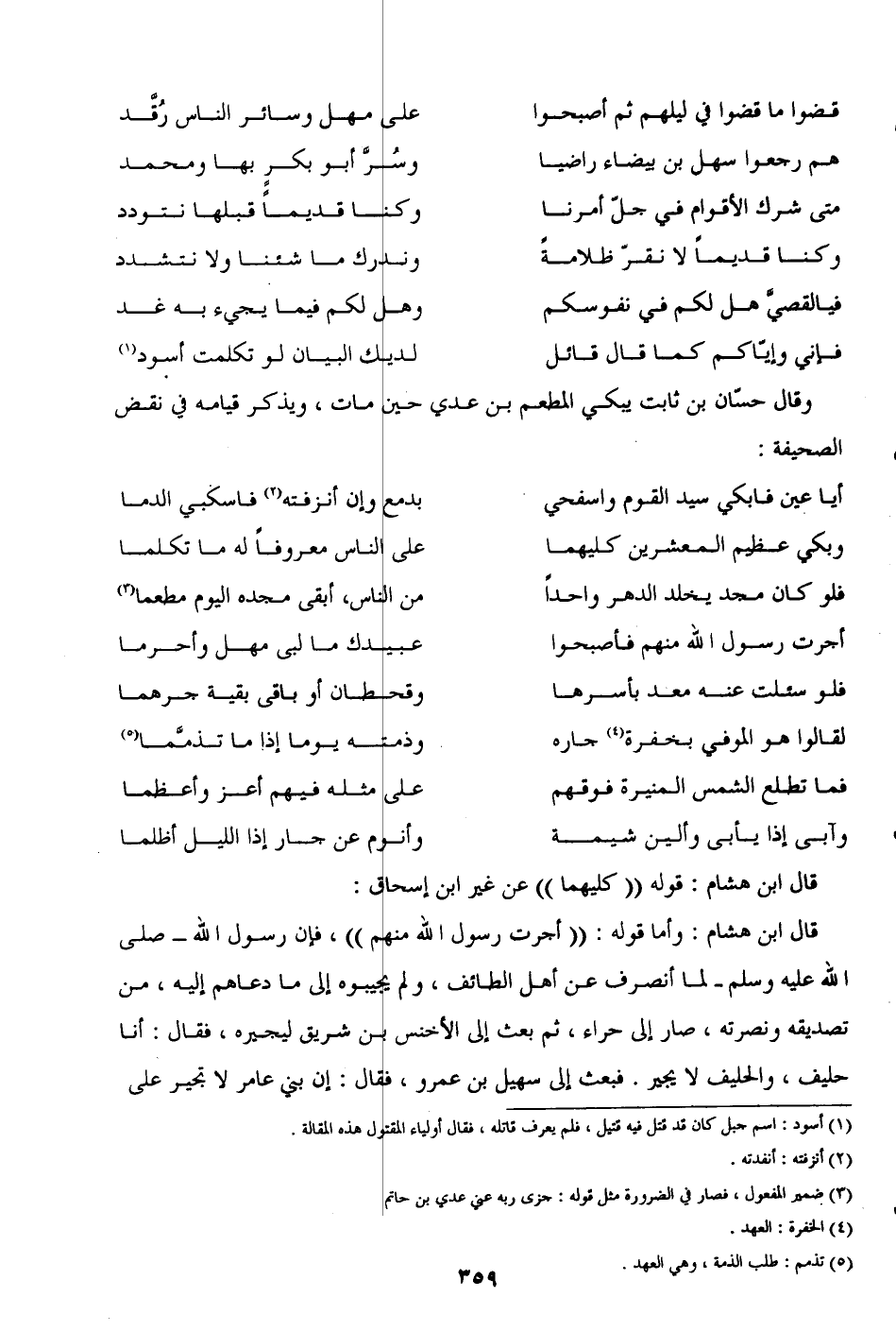 وقال حسَّان بن ثابت يبكي المطعم بن عدي حين مات، ويذكر قيامه في نقض الصحيفة: