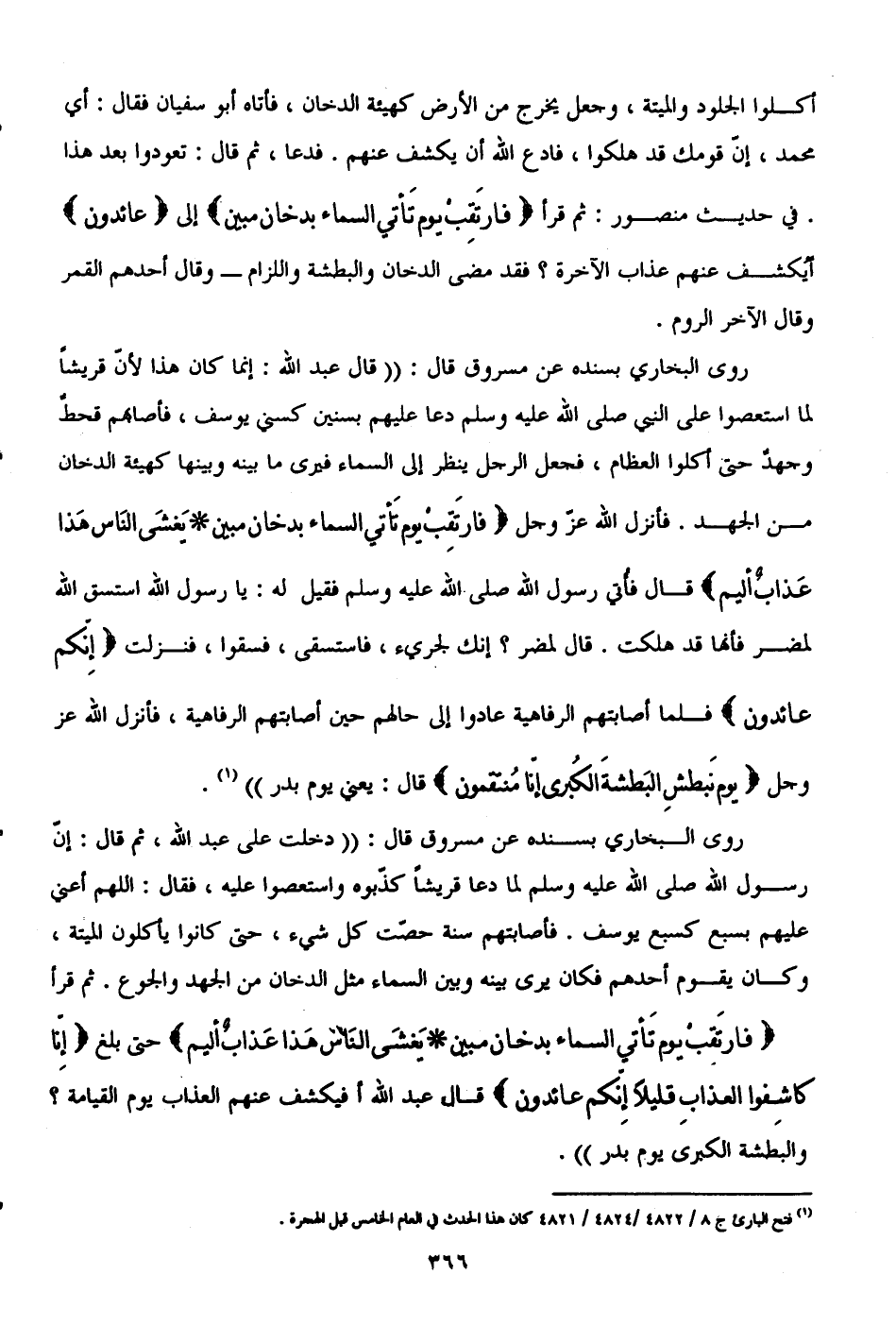 روى البخاري بسنده عن مسروق قال: "دخلت على عبد الله، ثم قال: إنَّ رسول الله - صلى الله عليه وسلم - لما دعا قريشًا كذّبوه واستعصوا عليه، فقال: اللَّهم أعني عليهم بسبع كسبع يوسف. فأصابتهم سنة حصّت كل شيء، حتى كانوا يأكلون الميتة، وكان يقوم أحدهم فكان يرى بينه وبين السماء مثل الدخان من الجهد والجوع. ثم قرأ {فَارْتَقِبْ يَوْمَ تَأْتِي السَّمَاءُ بِدُخَانٍ مُبِينٍ (10) يَغْشَى النَّاسَ هَذَا عَذَابٌ أَلِيمٌ} حتى بلغ {إِنَّا كَاشِفُو الْعَذَابِ قَلِيلًا إِنَّكُمْ عَائِدُونَ}، قال عبد الله أفيكشف عنهم العذاب يوم القيامة؟ والبطشة الكبرى يوم بدر".