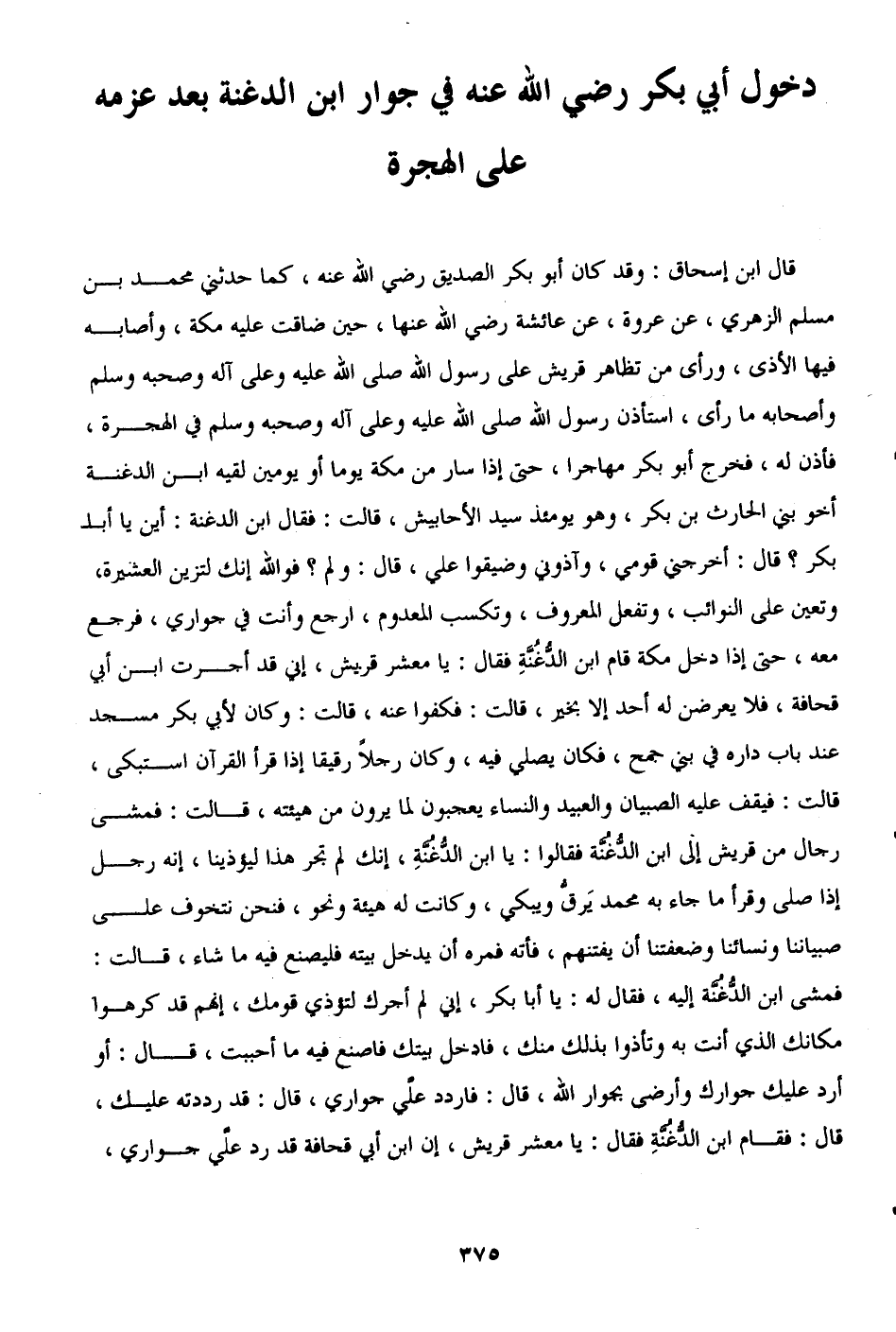 قال ابن إسحاق: وقد كان أبو بكر الصديق -رضي الله عنه-، كما حدثني محمَّد بن مسلم الزهري، عن عروة، عن عائشة -رضي الله عنها-، حين ضاقت عليه مكة، وأصابه فيها الأذى، ورأى من تظاهر قريش على رسول الله صلى الله عليه وعلى آله وصحبه وسلم وأصحابه ما رأى، استأذن رسول الله صلى الله عليه وعلى آله وصحبه وسلم في الهجرة، فأذن له، فخرج أبو بكر مهاجرًا، حتى إذا سار من مكة يومًا أو يومين لقيه ابن الدغنة أخو بني الحارث بن بكر، وهو يومئذ سيد الأحابيش، قالت: فقال ابن الدغنة: أين يا أبا بكر؟ قال: أخرجني قومي، وأذوني وضيقوا علي، قال: ولم؟ فوالله إنك لتزين العشيرة، وتعين على النوائب، وتفعل المعروف، وتكسب المعدوم، ارجع وأنت في جواري، فرجع معه، حتى إذا دخل مكة قام ابن الدُّغُنَّةِ فقال: يا معشر قريش، إني قد أجرت ابن أبي قحافة، فلا يعرضن له أحد إلا بخير، قالت: فكفوا عنه، قالت: وكان لأبي بكر مسجد عند باب داره في بني جمح، فكان يصلى فيه، وكان رجلًا رقيقًا إذا قرأ القرآن استبكى، قالت: فيقف عليه الصبيان والعبيد والنساء يعجبون لما يرون من هيئته، قالت: فمشى رجال من قريش إلى ابن الدُّغُنَّة فقالوا: يا ابن الدُّغُنَّةِ، إنك لم تجر هذا ليؤذينا، إنه رجل إذا صلى وقرأ ما جاء به محمَّد يَرقُّ ويبكي، وكانت له هيئة ونحو، فنحن نتخوف على صبياننا ونسائنا وضعفتنا أن يفتنهم، فأته فمره أن يدخل بيته فليصنع فيه ما شاء، قالت: فمشى ابن الدُّغُنَّة إليه، فقال له: يا أبا بكر، إني لم أجرك لتؤذي قومك، إنهم قد كرهوا مكانك الذي أنت به وتأذوا بذلك منك، فادخل بيتك فاصنع فيه ما أحببت، قال: أو أرد عليك جوارك وأرضى بجوار الله، قال: فاردد عليَّ جواري، قال: قد رددته عليك، قال: فقام ابن الدُّغُنَّةِ فقال: يا معشر قريش، إن ابن أبي قحافة قد رد عليَّ جواري،
