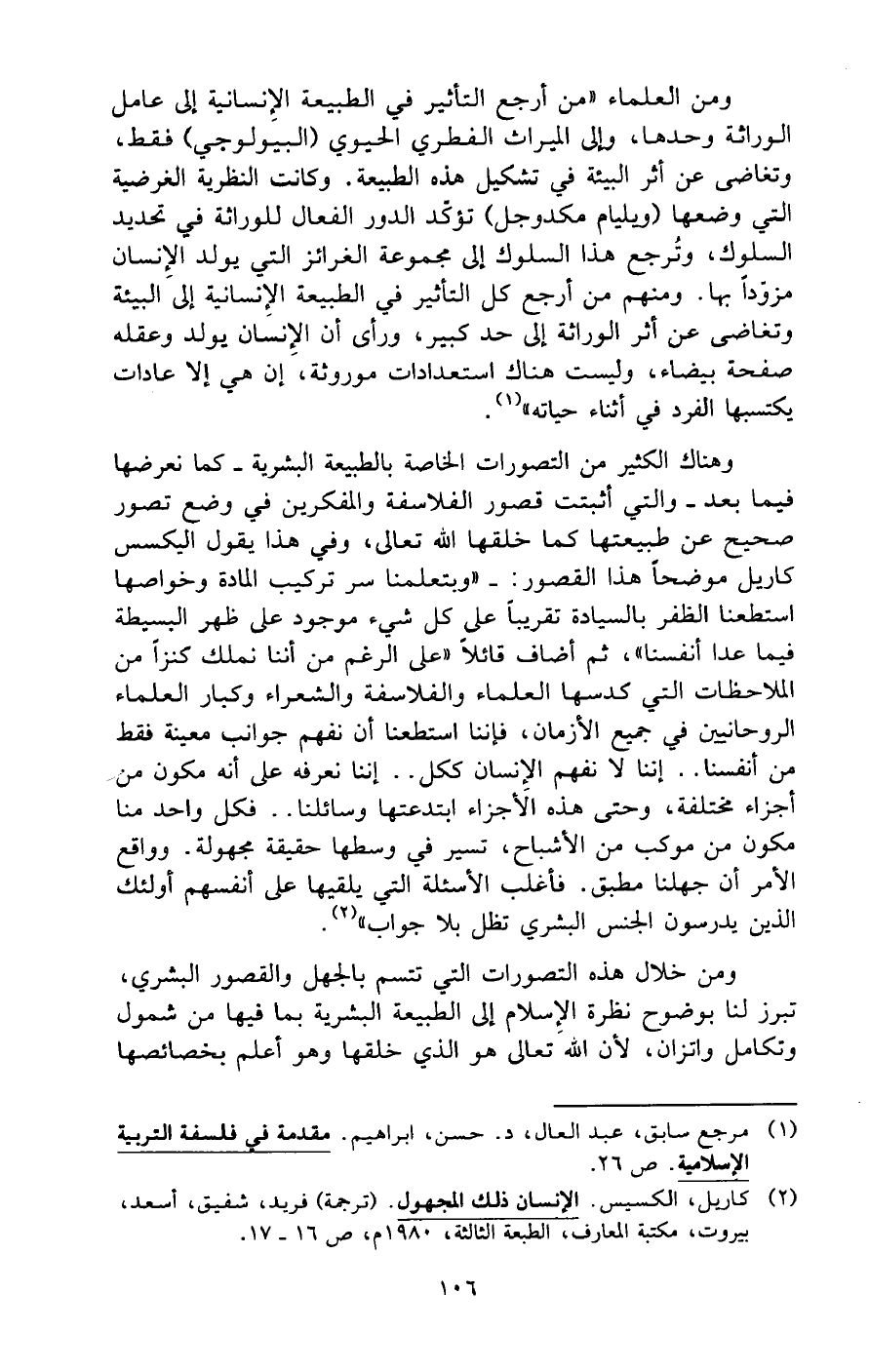 (¬2) كاريل، الكسيس. الإنسان ذلك المجهول. (ترجمة) فريد، شفيق، أسعد، بيروت، مكتبة المعارف، الطبعة الثالثة، 1980 م، ص 16 - 17.
