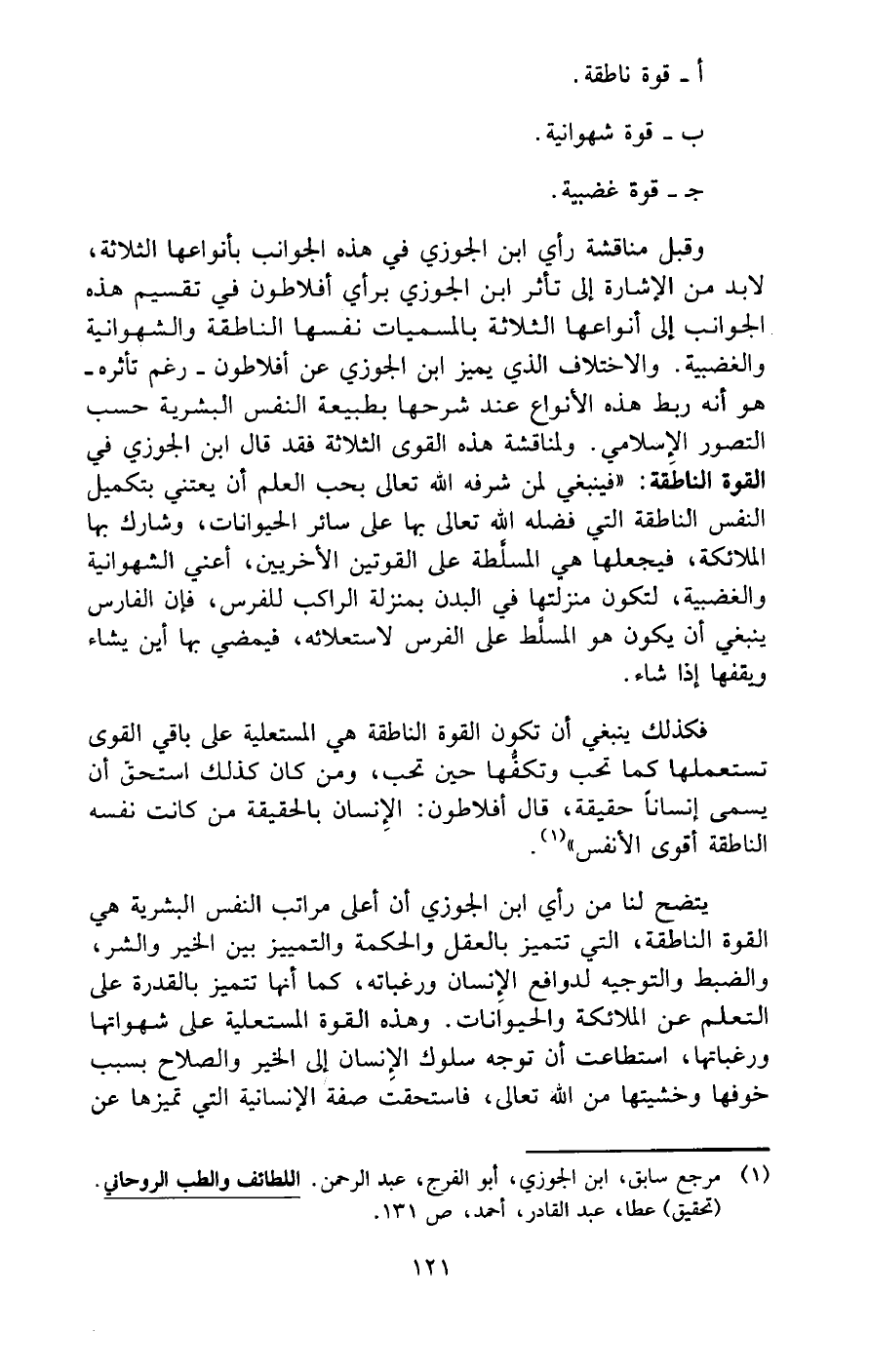 (¬1) مرجع سابق، ابن الجوزي، أبو الفرج، عبد الرحمن. اللطائف والطب الروحاني. (تحقيق) عطا، عبد القادر، أحمد، ص 131.