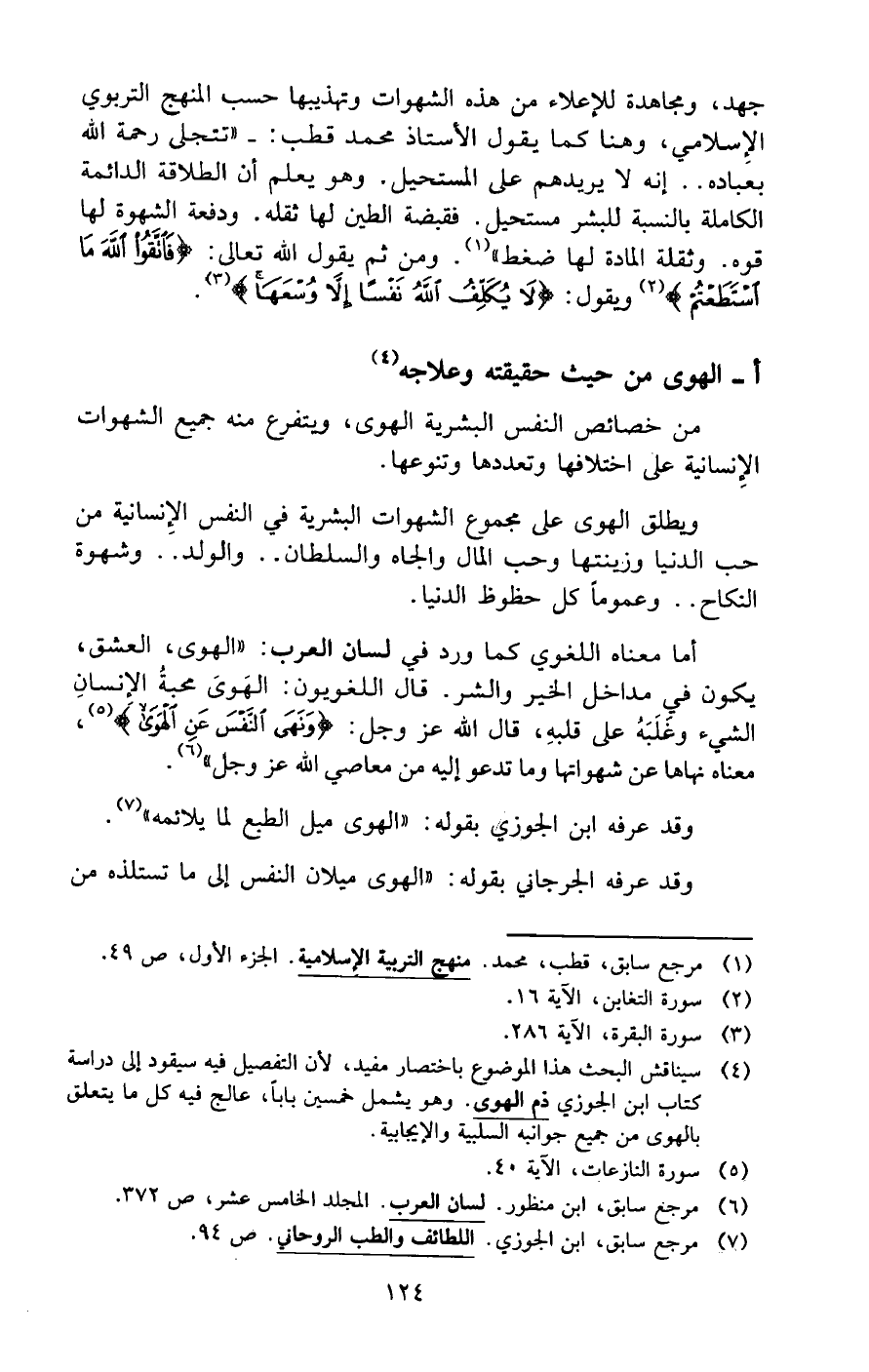 (¬4) سيناقش البحث هذا الموضوع باختصار مفيد، لأن التفصيل فيه سيقود إلى دراسة كتاب ابن الجوزي ذم الهوى. وهو يشمل خمسين بابًا، عالج فيه كل ما يتعلق بالهوى من جميع جوانبه السلبية والإيجابية.