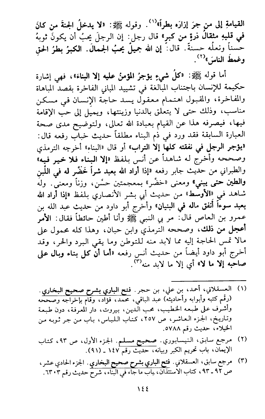 (¬1) العسقلاني، أحمد، بن علي، بن حجر. فتح الباري بشرح صحيح البخاري. (رقم كتبه وأبوابه وأحاديثه) عبد الباقي، محمد، فؤاد، وقام بإخراجه وصححه وأشرف على طبعه الخطيب، محب الدين، بيروت، دار المعرفة، دون طبعة وتاريخ، الجزء العاشر، ص 257، كلتاب اللباس، باب من جر ثوبه من الخيلاء، حديث رقم 5788.