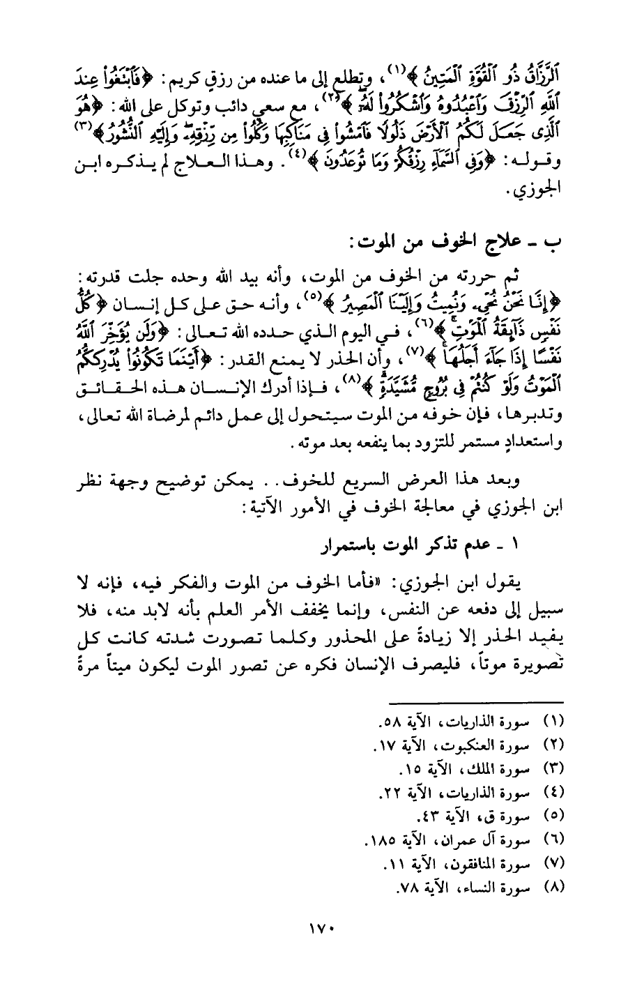 الرَّزَّاقُ ذُو الْقُوَّةِ الْمَتِينُ} (¬1)، وتطلع إلى ما عنده من رزقٍ كريم: {فَابْتَغُوا عِنْدَ اللَّهِ الرِّزْقَ وَاعْبُدُوهُ وَاشْكُرُوا لَهُ} (¬2)، مع سعي دائب وتوكل على الله: {هُوَ الَّذِي جَعَلَ لَكُمُ الْأَرْضَ ذَلُولًا فَامْشُوا فِي مَنَاكِبِهَا وَكُلُوا مِنْ رِزْقِهِ وَإِلَيْهِ النُّشُورُ} (¬3) وقوله: {وَفِي السَّمَاءِ رِزْقُكُمْ وَمَا تُوعَدُونَ} (¬4). وهذا العلاج لم يذكره ابن الجوزي.