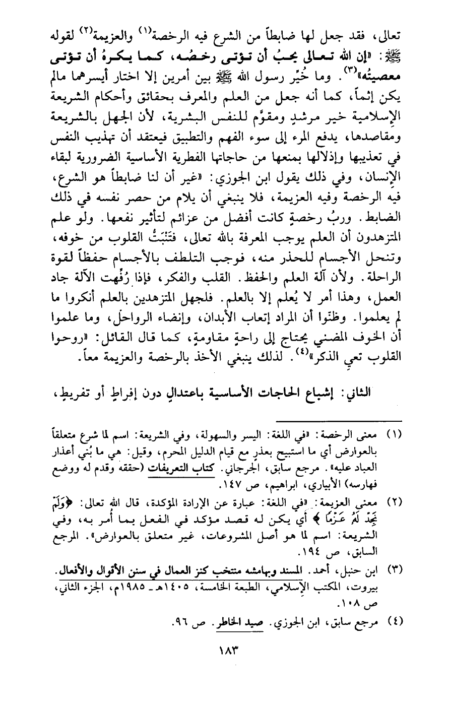 (¬2) معنى العزيمة: "في اللغة: عبارة عن الإرادة المؤكدة، قال الله تعالى: {وَلَمْ نَجِدْ لَهُ عَزْمًا} أي يكن له قصد مؤكد في الفعل بما أُمر به، وفي الشريعة: اسم لما هو أصل المشروعات، غير متعلق بالعوارض". المرجع السابق، ص 194.