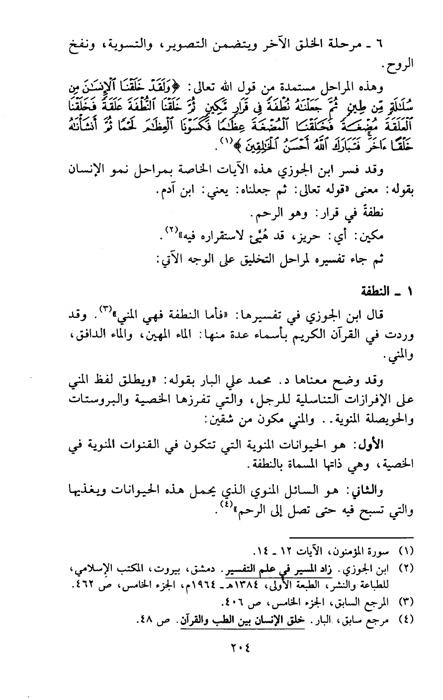 وهذه المراحل مستمدة من قول الله تعالى: {وَلَقَدْ خَلَقْنَا الْإِنْسَانَ مِنْ سُلَالَةٍ مِنْ طِينٍ (12) ثُمَّ جَعَلْنَاهُ نُطْفَةً فِي قَرَارٍ مَكِينٍ (13) ثُمَّ خَلَقْنَا النُّطْفَةَ عَلَقَةً فَخَلَقْنَا الْعَلَقَةَ مُضْغَةً فَخَلَقْنَا الْمُضْغَةَ عِظَامًا فَكَسَوْنَا الْعِظَامَ لَحْمًا ثُمَّ أَنْشَأْنَاهُ خَلْقًا آخَرَ فَتَبَارَكَ اللَّهُ أَحْسَنُ الْخَالِقِينَ} (¬1).