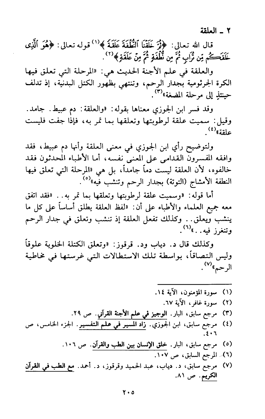 ولتوضيح رأي ابن الجوزي في معنى العلقة وأنها دم عبيط، فقد وافقه المفسرون القدامى على المعنى نفسه، أما الأطباء المحدثون فقد خالفوه، لأن العلقة ليست دمًا جامدًا، بل هي "المرحلة التي تعلق فيها النطفة الأمشاج (التوتة) بجدار الرحم وتنشب فيه" (¬5).