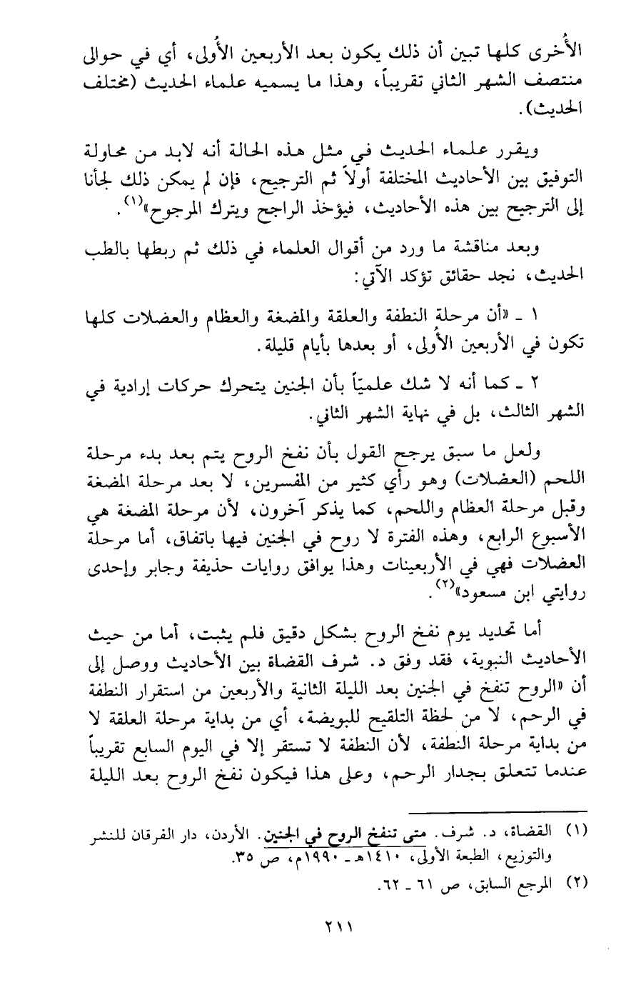 (¬1) القضاة، د. شرف. متى تنفخ الروح في الجنين. الأردن، دار الفرقان للنشر والتوزيع، الطبعة الأولى، 1410 هـ - 1990 م، ص 35.