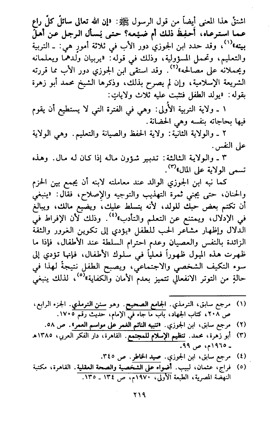 اشتق هذا المعنى أيضًا من قول الرسول - صلى الله عليه وسلم -: "إن الله تعالى سائل كل راع عما استرعاه، أَحفِظَ ذلك أم ضيعه؟ حتى يُسأل الرجل عن أهلَ بيته" (¬1)، وقد حدد ابن الجوزي دور الأب في ثلاثة أمور هي: التربية والتعليم، وتحمل المسؤولية، وذلك في قوله: "يربيان ولدهما ويعلمانه ويحملانه على مصالحه" (¬2). وقد استقى ابن الجوزي دور الأب مما قررته الشريعة الإسلامية، وإن لم يصرح بذلك، وذكرها الشيخ محمد أبو زهرة بقوله: "يولد الطفل فتثبت عليه ثلاث ولايات: