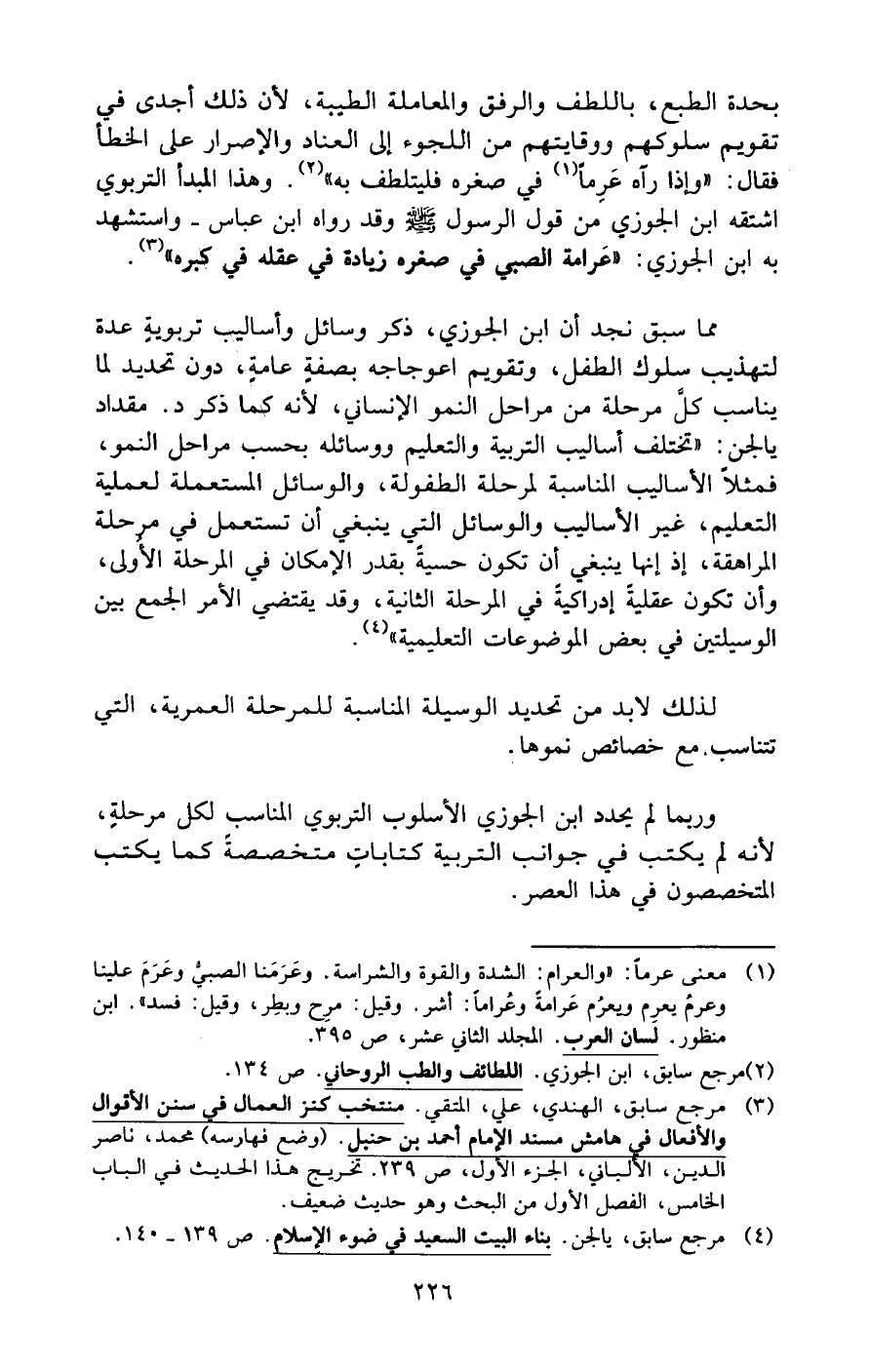 مما سبق نجد أن ابن الجوزي، ذكر وسائل وأساليب تربوية عدة لتهذيب سلوك الطفل، وتقويم اعوجاجه بصفة عامةٍ، دون تحديد لما يناسب كل مرحلة من مراحل النمو الإنساني، لأنه كما ذكر د. مقداد يالجن: "تختلف أساليب التربية والتعليم ووسائله بحسب مراحل النمو، فمثلًا الأساليب المناسبة لمرحلة الطفولة، والوسائل المستعملة لعملية التعليم، غير الأساليب والوسائل التي ينبغي أن تستعمل في مرحلة المراهقة، إذ إنها ينبغي أن تكون حسية بقدر الإمكان في المرحلة الأولى، وأن تكون عقلية إدراكيةً في المرحلة الثانية، وقد يقتضي الأمر الجمع بين الوسيلتين في بعض الموضوعات التعليمية" (¬4).