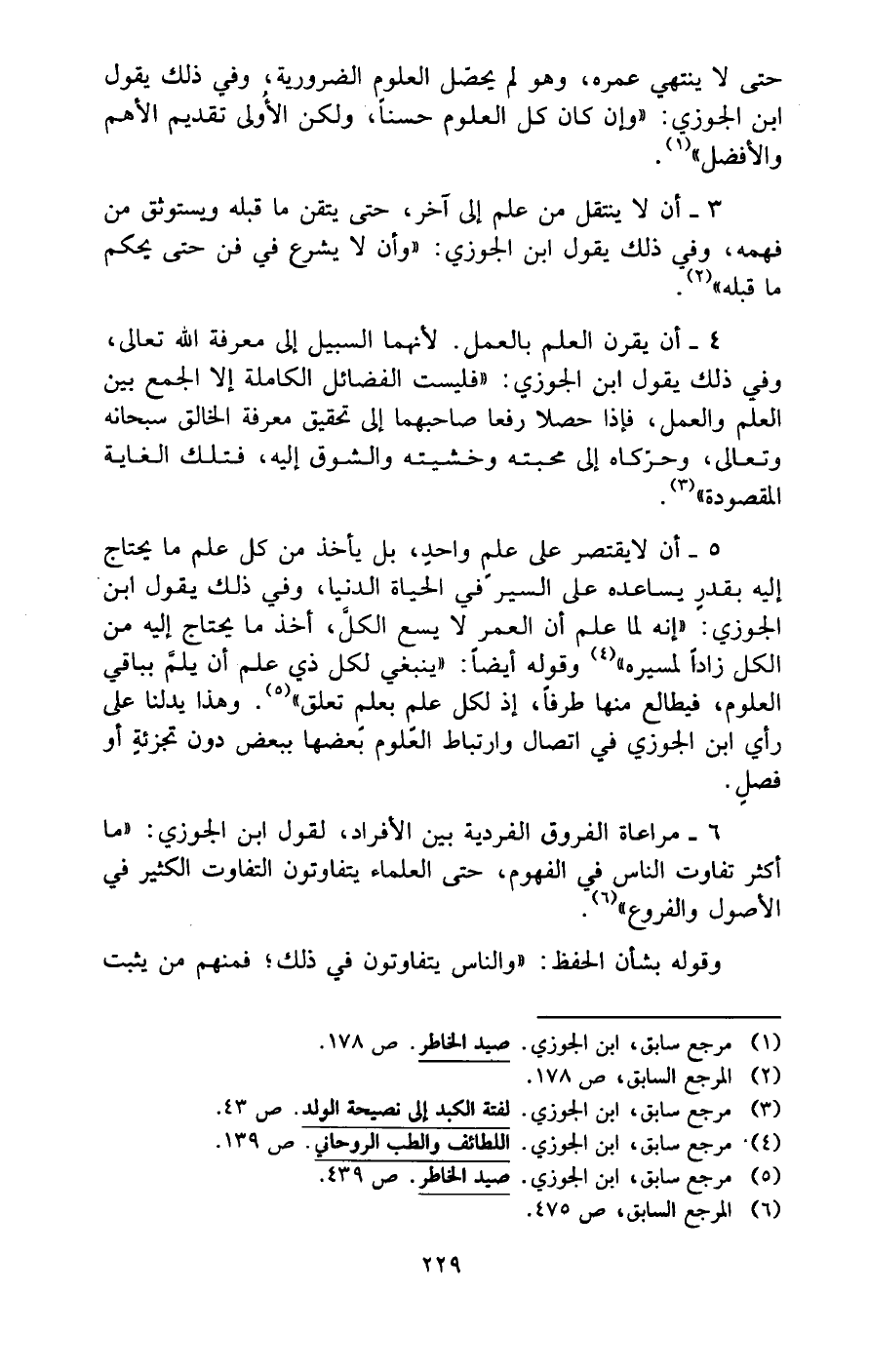 6 - مراعاة الفروق الفردية بين الأفراد، لقول ابن الجوزي: "ما أكثر تفاوت الناس في الفهوم، حتى العلماء يتفاوتون التفاوت الكثير في الأصول والفروع" (¬6).