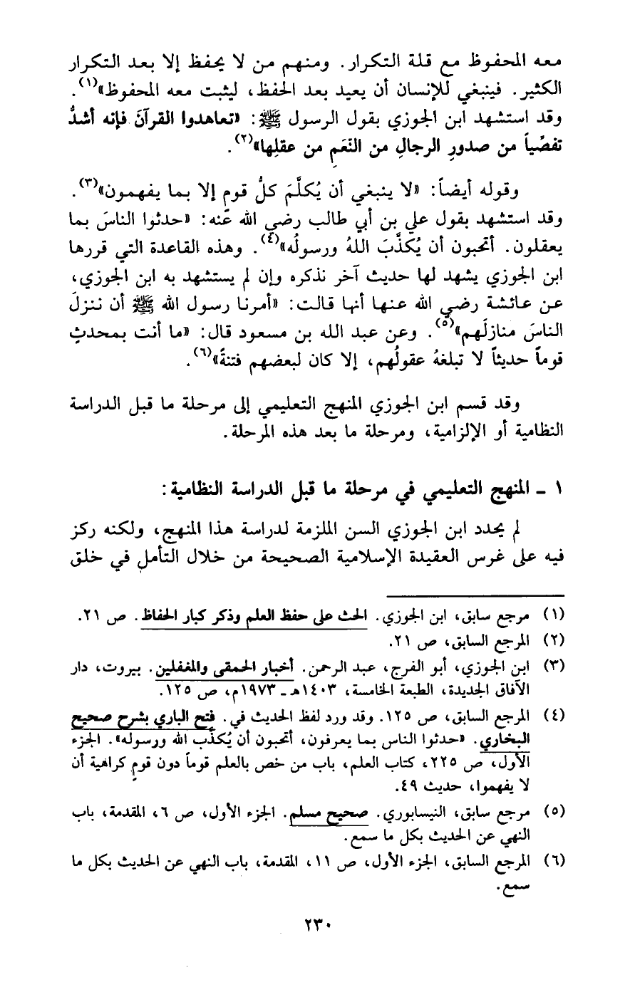 (¬4) المرجع السابق، ص 125. وقد ورد لفظ الحديث في. فتح البارى بشرح صحيح البخاري. "حدثوا الناس بما يعرفرن، أتحبون أن يكذب الله ورسوله". الجزء الأول , ص 225، كتاب العلم، باب من خص بالعلم قومًا دون قوم كراهية أن لا يفهموا، حديث 49.