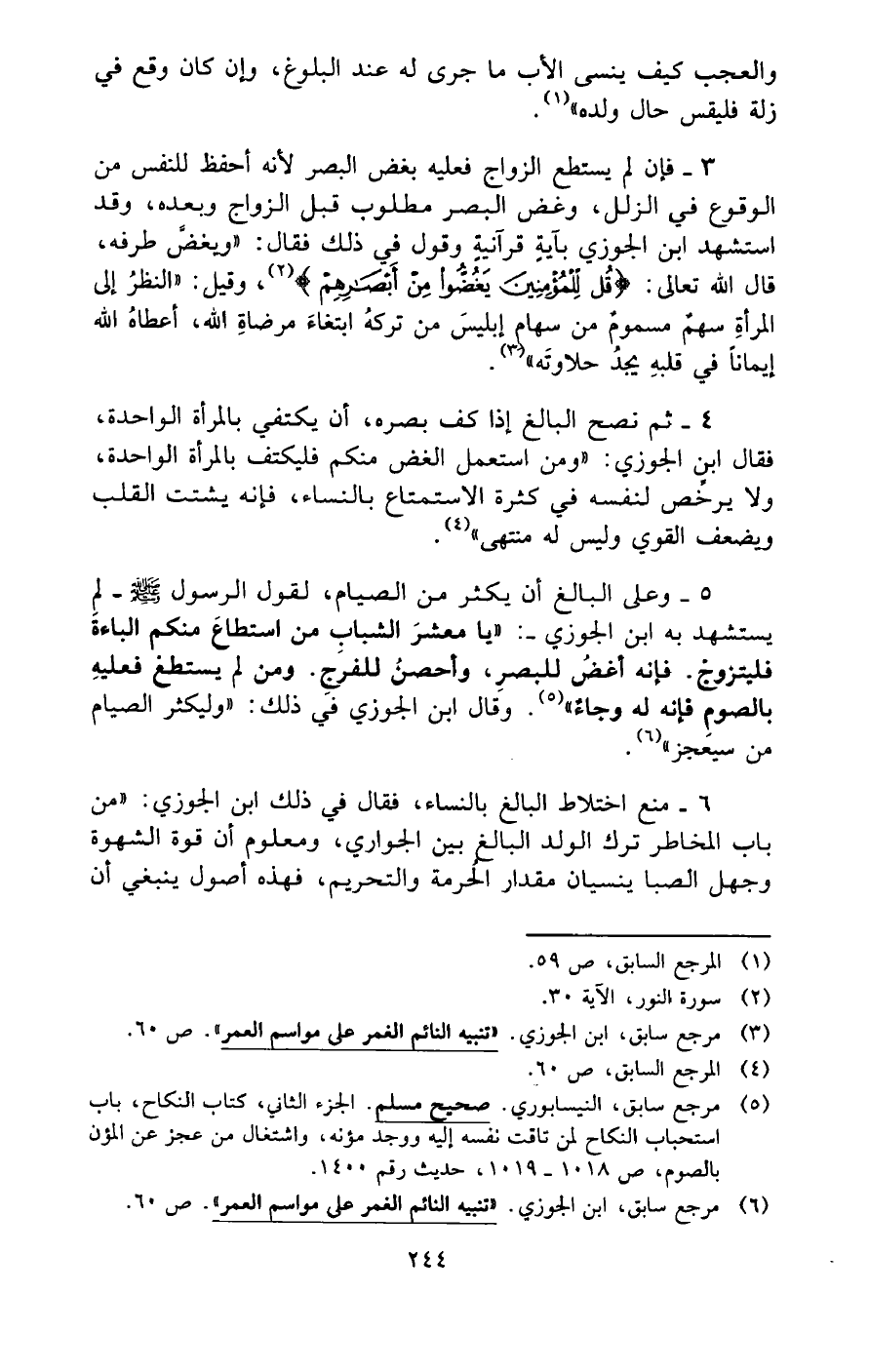 3 - فإن لم يستطع الزواج فعليه بغض البصر لأنه أحفظ للنفس من الوقوع في الزلل، وغض البصر مطلوب قبل الزواج وبعده، وقد استشهد ابن الجوزي بآية قرآنية وقول في ذلك فقال: "ويغض طرفه، قال الله تعالى: {قُلْ لِلْمُؤْمِنِينَ يَغُضُّوا مِنْ أَبْصَارِهِمْ} (¬2)، وقيل: "النظرُ إلى المرأةِ سهم مسموم من سهام إبليسَ من تركهُ ابتغاءَ مرضاةِ الله، أعطاهُ الله إيمانًا في قلبهِ يجدُ حلاوتَه" (¬3).