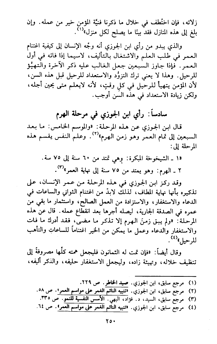وقد ركز ابن الجوزي في هذه المرحلة من عمر الإنسان، على تذكيره بأنها نهاية المطاف، لذلك لابد من اغتنام الثواني والساعات في الدعاء والاستغفار، والاستزادة من العمل الصالح، واستثمار ما بقي من عمره في الصدقة الجارية، ليصله أجرها بعد انقطاع عمله. قال عن هذه المرحلة: "ولم يبق زمنَ الهرم إلا تذكر ما مضى، فقد أدرك ما فات والاستغفار والدعاء وعمل ما يمكن من الخير اغتنامًا للساعات والتأهب للرحيل" (¬4).