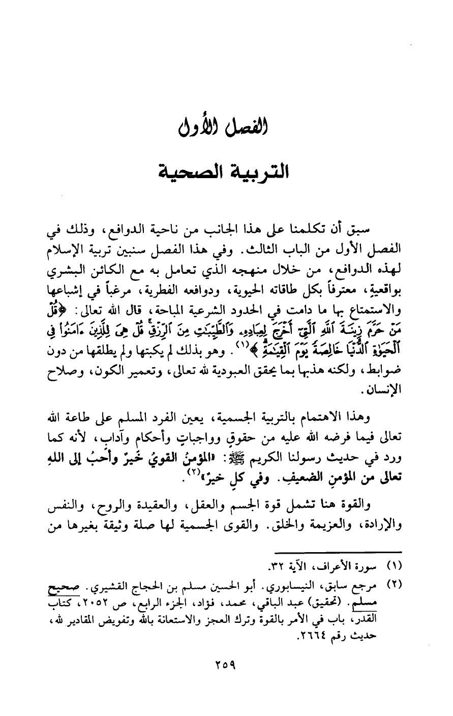 (¬2) مرجع سابق، النيسابوري. أبو الحسين مسلم بن الحجاج القشيري. صحيح مسلم. (تحقيق) عبد الباقي، محمد، فؤاد، الجزء الرابع، ص 2052، كتاب القدر، باب في الأمر بالقوة وترك العجز والاستعانة بالله وتفويض المقادير لله، حديث رقم 2664.