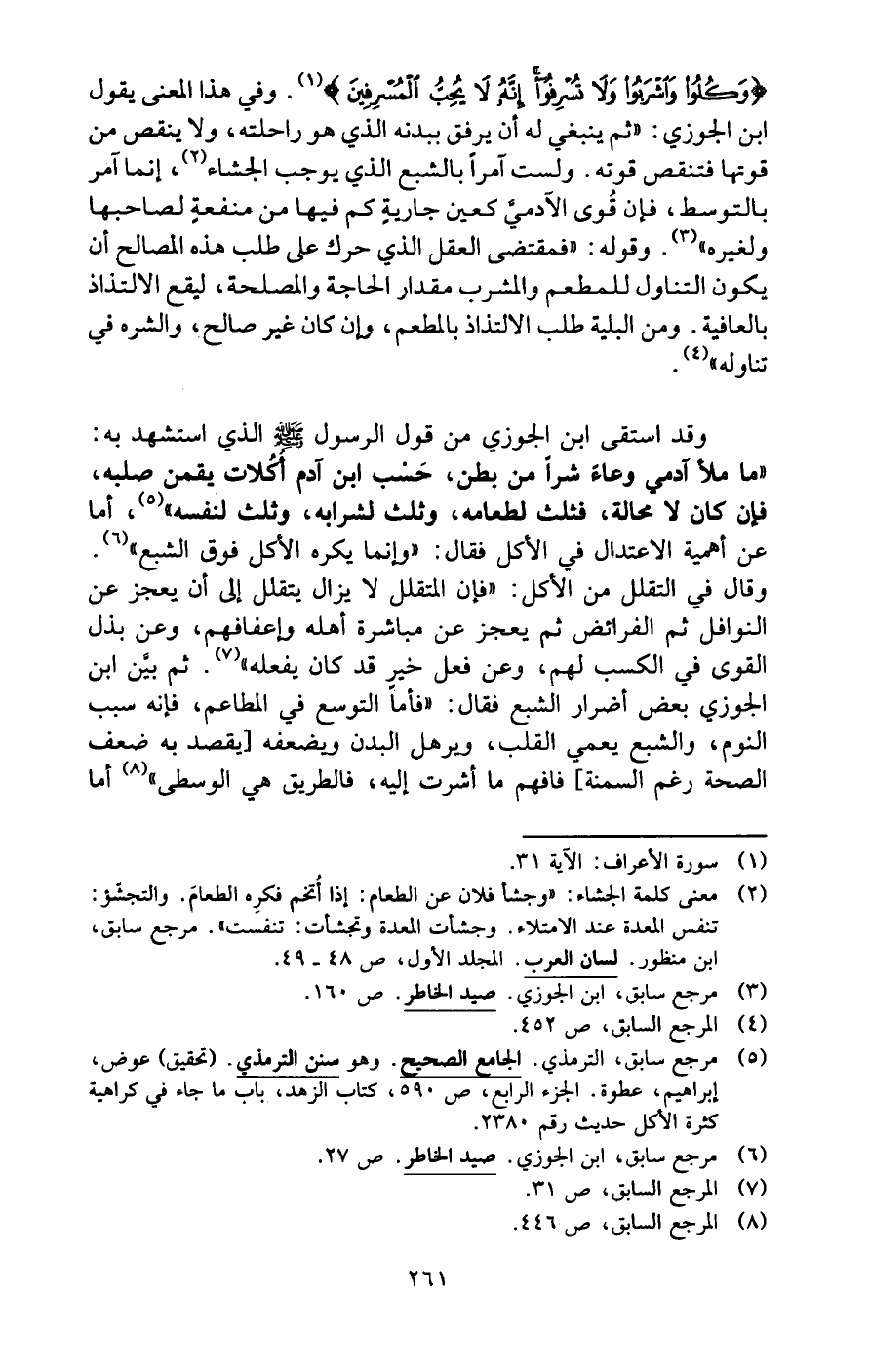 {وَكُلُوا وَاشْرَبُوا وَلَا تُسْرِفُوا إِنَّهُ لَا يُحِبُّ الْمُسْرِفِينَ} (¬1). وفي هذا المعنى يقول ابن الجوزي: "ثم ينبغي له أن يرفق ببدنه الذي هو راحلته، ولا ينقص من قوتها فتنقص قوته. ولست آمرًا بالشبع الذي يوجب الجشاء (¬2)، إنما آمر بالتوسط، فإن قُوى الآدمى كعين جاريةٍ كم فيها من منفعةٍ لصاحبها ولغيره" (¬3). وقوله: "فمقتضى العقل الذي حرك على طلب هذه المصالح أن يكون التناول للمطعم والمشرب مقدار الحاجة والمصلحة، ليقع الالتذاذ بالعافية. ومن البلية طلب الالتذاذ بالمطعم، وإن كان غير صالح، والشره في تناوله" (¬4).