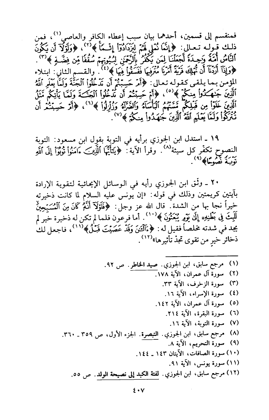 20 - وثّق ابن الجوزي رأيه في الوسائل الإيحائية لتقوية الإرادة بآيتين كريمتين وذلك في قوله: "إن يونس -عليه السلام- لما كانت ذخيرته خيرا نجا بها من الشدة. قال الله -عَزَّ وَجَلَّ-: {فَلَوْلَا أَنَّهُ كَانَ مِنَ الْمُسَبِّحِينَ (143) لَلَبِثَ فِي بَطْنِهِ إِلَى يَوْمِ يُبْعَثُونَ} (¬10). أما فرعون فلما لم تكن له ذخيرة خير لم يجد في شدته مخلصًا فقيل له: {آلْآنَ وَقَدْ عَصَيْتَ قَبْلُ} (¬11)، فاجعل لك ذخائر خيرٍ من تقوى تجدْ تأثيرها" (¬12).