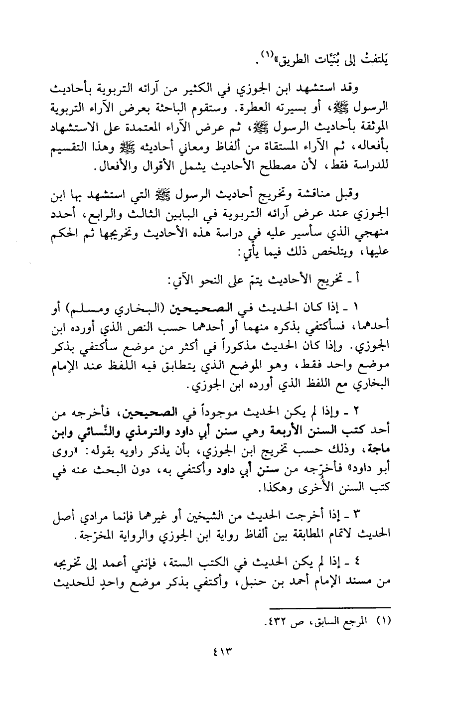 وقبل مناقشة وتخريج أحاديث الرسول - صلى الله عليه وسلم - التي استشهد بها ابن الجوزي عند عرض آرائه التربوية في البابين الثالث والرابع، أحدد منهجي الذي سأسير عليه في دراسة هذه الأحاديث وتخريجها ثم الحكم عليها، ويتلخص ذلك فيما يأتي: