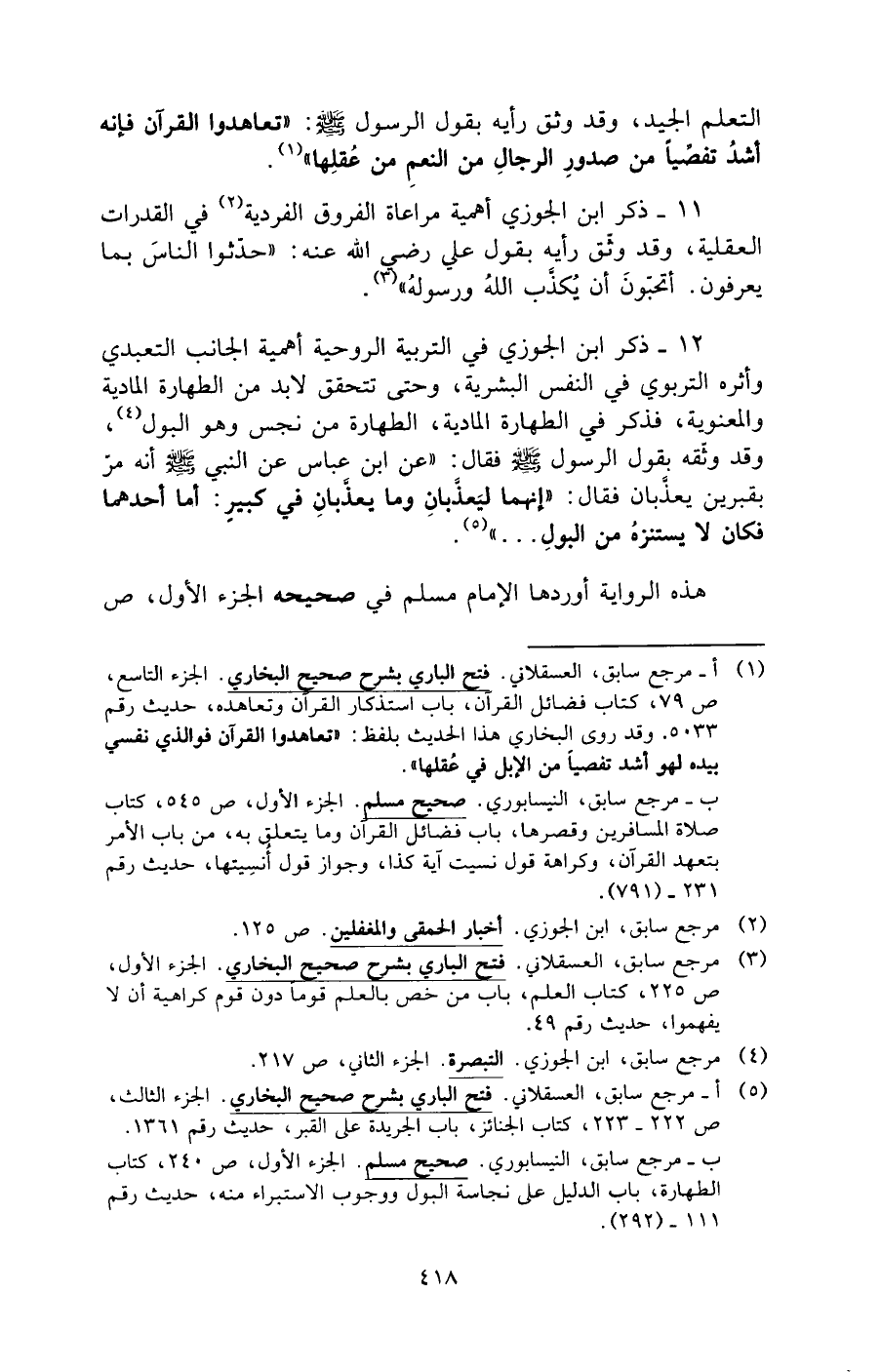 (¬1) أ - مرجع سابق، العسقلاني. فتح الباري بشرح صحيح البخاري. الجزء التاسع, ص 79، كتاب فضائل القرآن، باب استذكار القرآن وتعاهده، حديث رقم 5033. وقد روى البخاري هذا الحديث بلفظ: "تعاهدوا القرآن فوالذي نفسي بيده لهو أشد تفصيًا من الإبل في عُقلها".