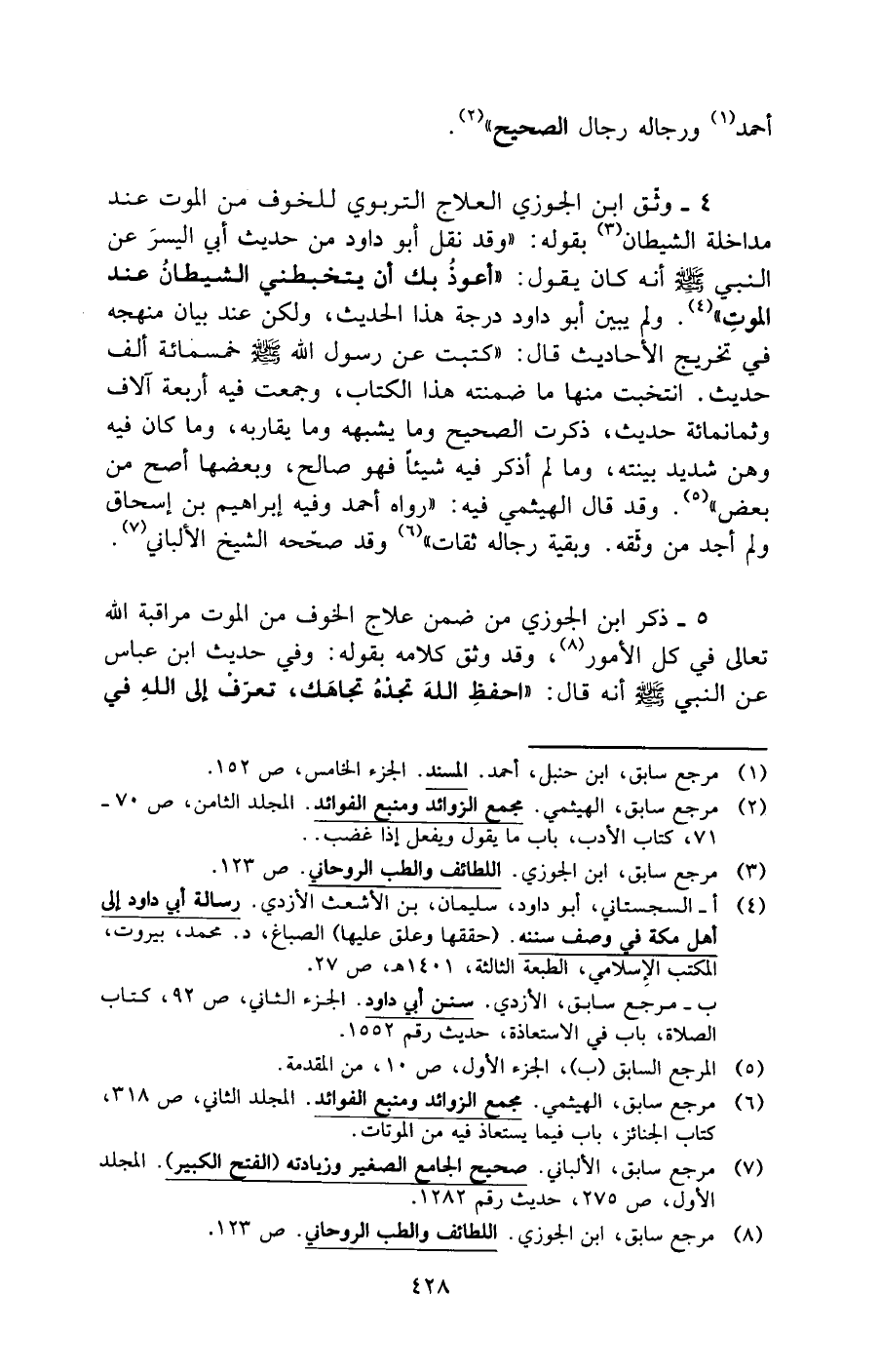 4 - وثّق ابن الجوزي العلاج التربوي للخوف من الموت عند مداخلة الشيطان (¬3) بقوله: "وقد نقل أبو داود من حديث أبي اليسرَ عن النبي - صلى الله عليه وسلم - أنه كان يقول: "أعوذُ بك أن يتخبطني الشيطانُ عند الموتِ" (¬4). ولم يبين أبو داود درجة هذا الحديث، ولكن عند بيان منهجه في تخريج الأحاديث قال: "كتبت عن رسول الله - صلى الله عليه وسلم - خمسمائة ألف حديث. انتخبت منها ما ضمنته هذا الكتاب، وجمعت فيه أربعة آلاف وثمانمائة حديث، ذكرت الصحيح وما يشبهه وما يقاربه، وما كان فيه وهن شديد بينته، وما لم أذكر فيه شيئًا فهو صالح، وبعضها أصح من بعض" (¬5). وقد قال الهيثمي فيه: "رواه أحمد وفيه إبراهيم بن إسحاق ولم أجد من وثقه. وبقية رجاله ثقات" (¬6) وقد صحّحه الشيخ الألباني (¬7).