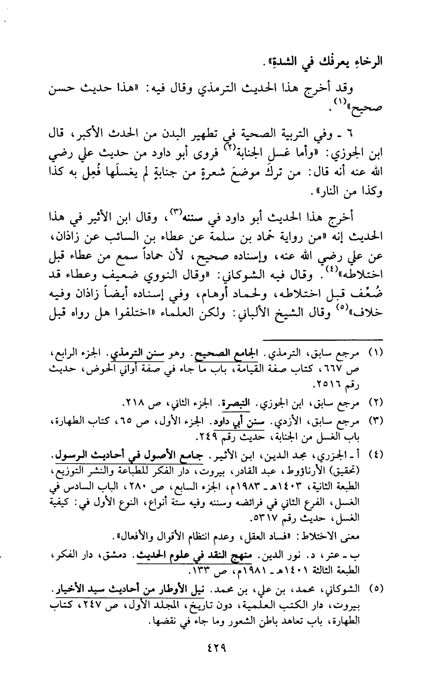(¬5) الشوكاني، محمد، بن علي، بن محمد. نيل الأوطار من أحاديث سيد الأخيار. بيروت، دار الكتب العلمية، دون تاريخ، المجلد الأول، ص 247، كتاب الطهارة، باب تعاهد باطن الشعور وما جاء في نقضها.
