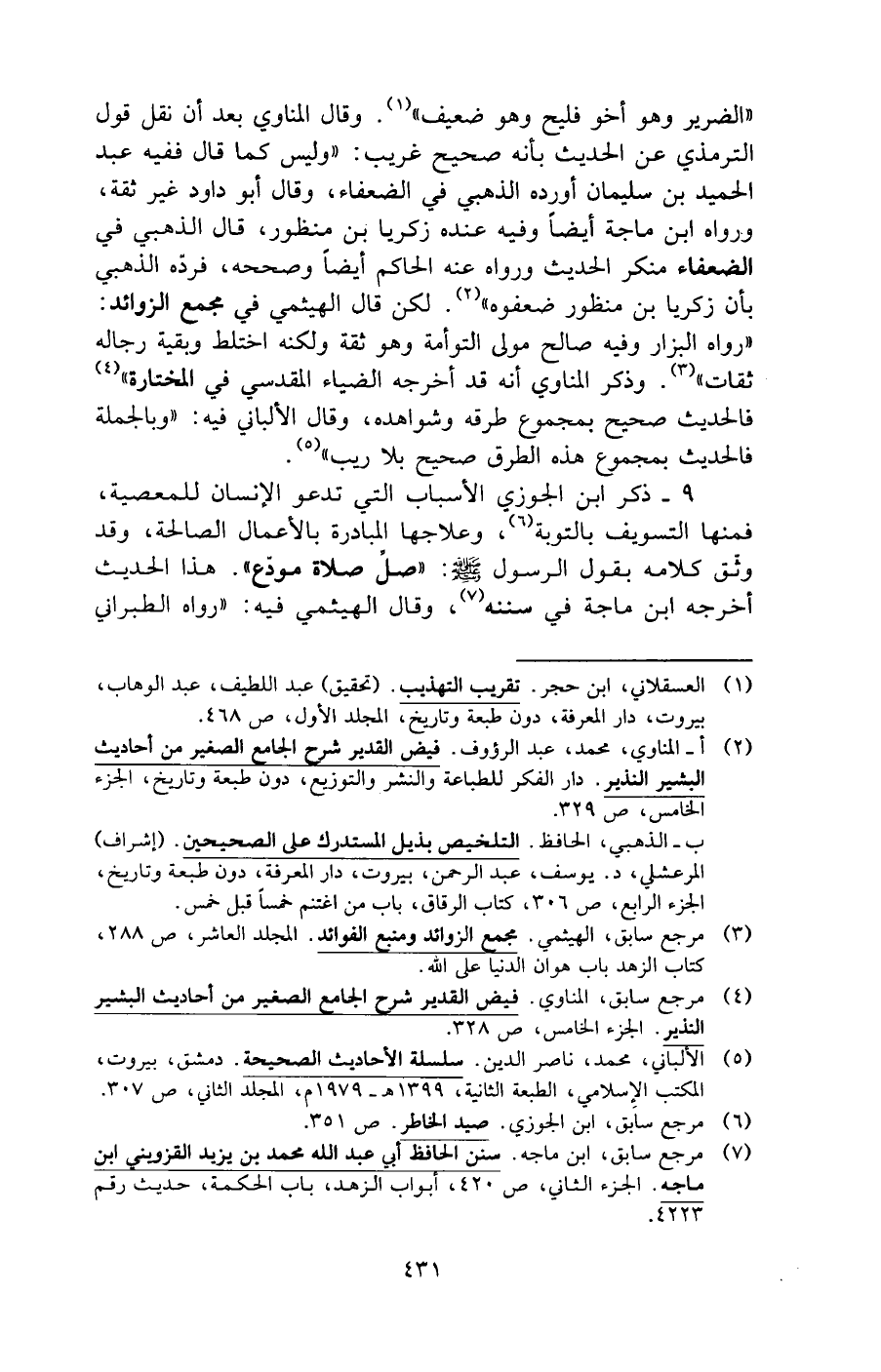 9 - ذكر ابن الجوزي الأسباب التي تدعو الإنسان للمعصية، فمنها التسويف بالتوبة (¬6)، وعلاجها المبادرة بالأعمال الصالحة، وقد وثّق كلامه بقول الرسول - صلى الله عليه وسلم -: "صلِّ صلاة مودّع". هذا الحديث أخرجه ابن ماجه في سننه (¬7)، وقال الهيثمي فيه: "رواه الطبراني