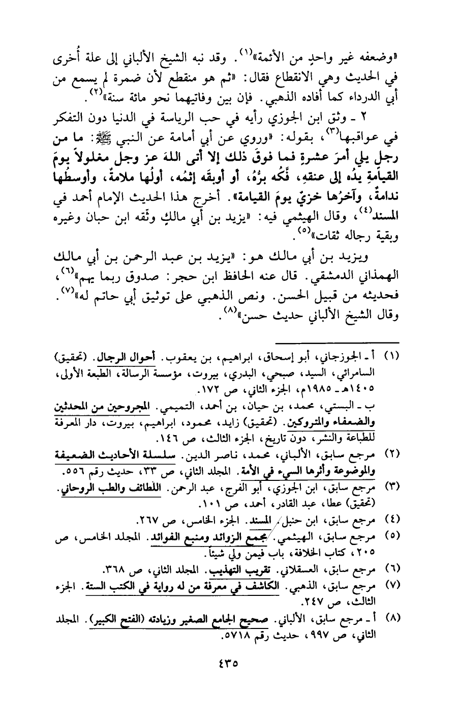 2 - وثق ابن الجوزي رأيه في حب الرياسة في الدنيا دون التفكر في عواقبها (¬3)، بقوله: "وروي عن أبي أمامة عن النبي - صلى الله عليه وسلم -: ما من رجل يلي أمرَ عشرةِ فما فوقَ ذلك إلا أتى اللهَ -عَزَّ وَجَلَّ- مغلولًا يومَ القيامةِ يدُه الى عنقهِ، فَكَّه برُّهُ، أو أوبقَه إثمُه، أولُها ملامةٌ، وأوسطُها ندامةٌ، وآخرُها خزيٌ يومَ القيامة". أخرج هذا الحديث الإمام أحمد في المسند (¬4)، وقال الهيثمي فيه: "يزيد بن أبي مالكٍ وثقه ابن حبان وغيره وبقية رجاله ثقات" (¬5).