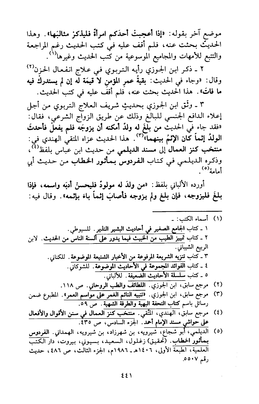 3 - وثّق ابن الجوزي بحديثٍ شريف العلاج التربوي من أجل إعلاء الدافع الجنسي للبالغ وذلك عن طريق الزواج الشرعي، فقال: "فقد جاء في الحديث من بلغَ له ولدٌ أمكنه أن يزوجَه فلم يفعل فأحدثَ الولدُ إثمًا كان الإثمُ بينهما" (¬3). هذا الحديث عزاه المتقي الهندي في: منتخب كنز العمال إلى مسند الديلمي من حديث ابن عباس بلفظ (¬4)، وذكره الديلمي في كتاب الفردوس بمأثور الخطاب من حديث أبي أمامة (¬5).