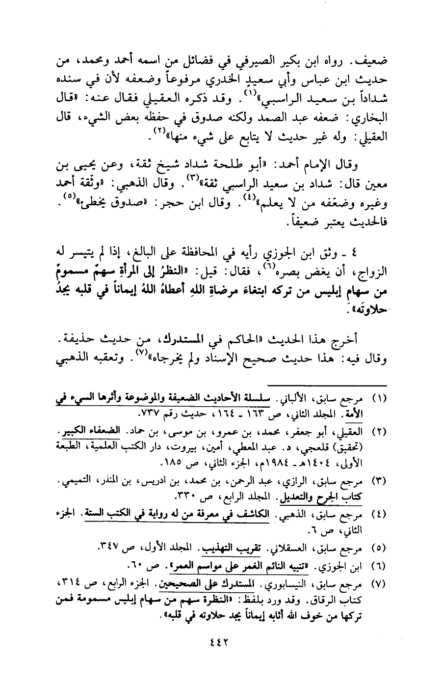 (¬7) مرجع سابق، النيسابوري. المستدرك على الصحيحين. الجزء الرابع، ص 314، كتاب الرقاق. وقد ورد بلفظ: "النظرة سهم من سهام إبليس مسمومة فمن تركها من خوف الله أثابه إيمانًا يجد حلاوته في قلبه".