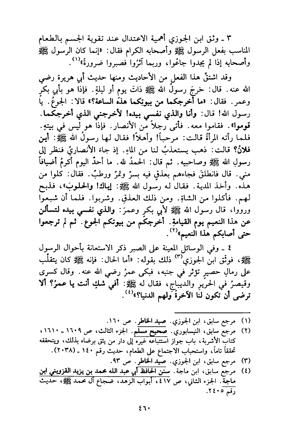 3 - وثق ابن الجوزي أهمية الاعتدال عند تقوية الجسم بالطعام المناسب بفعل الرسول - صلى الله عليه وسلم - وأصحابه الكرام فقال: "إنما كان الرسول - صلى الله عليه وسلم - وأصحابه إذا لم يجدوا جاعُوا، وربما آثرُوا فصبروا ضرورة" (¬1).