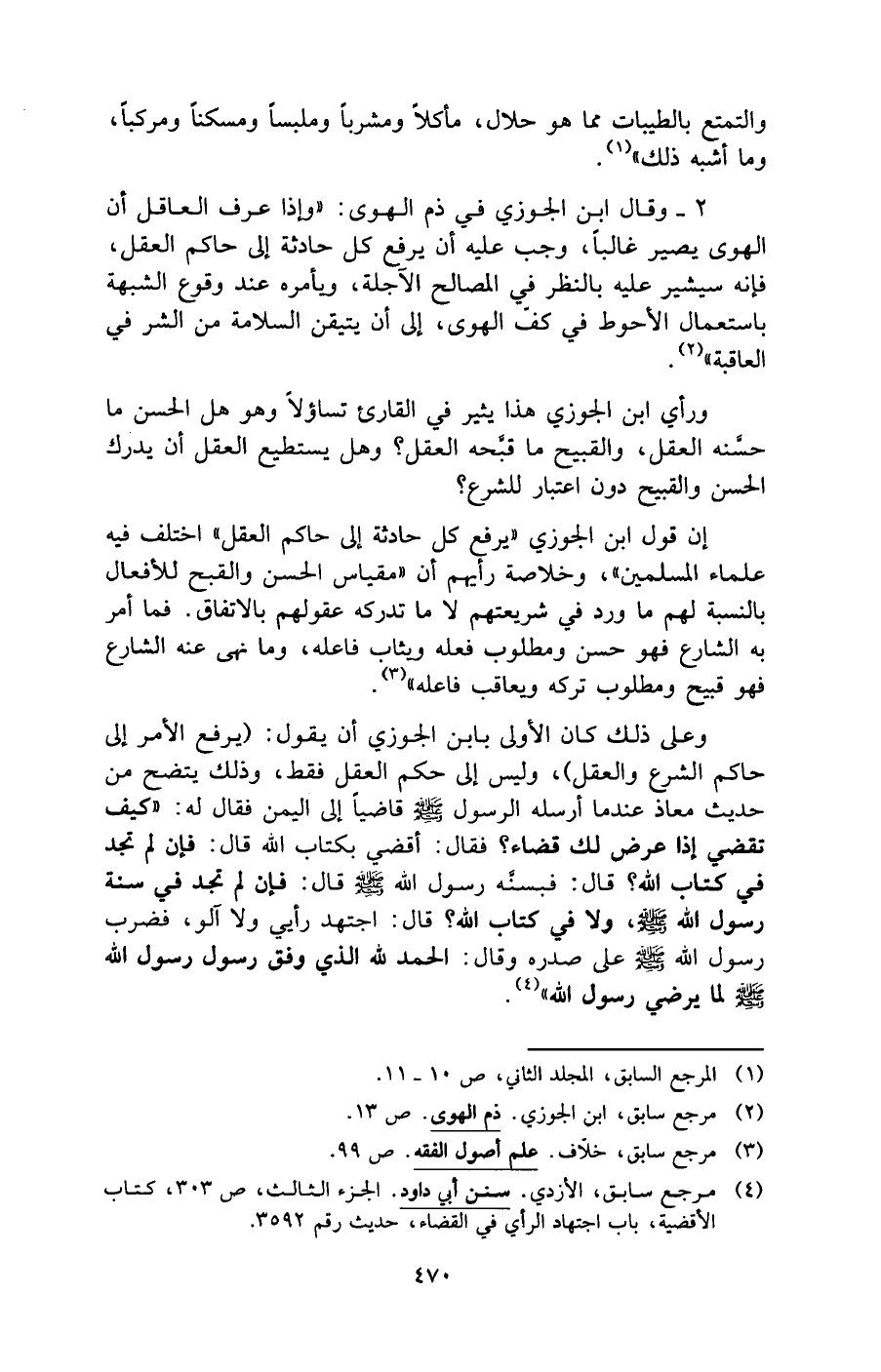 وعلى ذلك كان الأولى بابن الجوزي أن يقول: (يرفع الأمر إلى حاكم الشرع والعقل)، وليس إلى حكم العقل فقط، وذلك يتضح من حديث معاذ عندما أرسله الرسول - صلى الله عليه وسلم - قاضيًا إلى اليمن فقال له: "كيف تقضي إذا عرض لك قضاء؟ فقال: أقضي بكتاب الله قال: فإن لم تجد في كتاب الله؟ قال: فبسنَّة رسول الله - صلى الله عليه وسلم - قال: فإن لم تجد في سنة رسول الله - صلى الله عليه وسلم -، ولا في كتاب الله؟ قال: اجتهد رأيي ولا آلو، فضرب رسول الله - صلى الله عليه وسلم - على صدره وقال: الحمد لله الذي وفق رسول رسول الله - صلى الله عليه وسلم - لما يرضي رسول الله" (¬4).