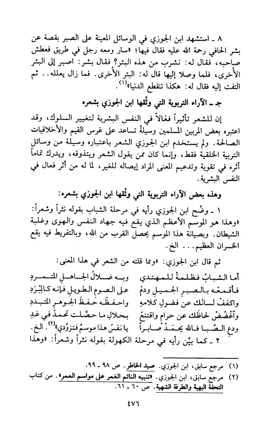 1 - وضَّح ابن الجوزي رأيه في مرحلة الشباب بقوله نثرًا وشعرًا: "وهذا هو الموسم الأعظم الذي يقع فيه جهاد النفس والهوى وغلبة الشيطان. وبصيانة هذا الموسم يحصل القرب من الله، وبالتفريط فيه يقع الخسران العظيم. . . الخ.