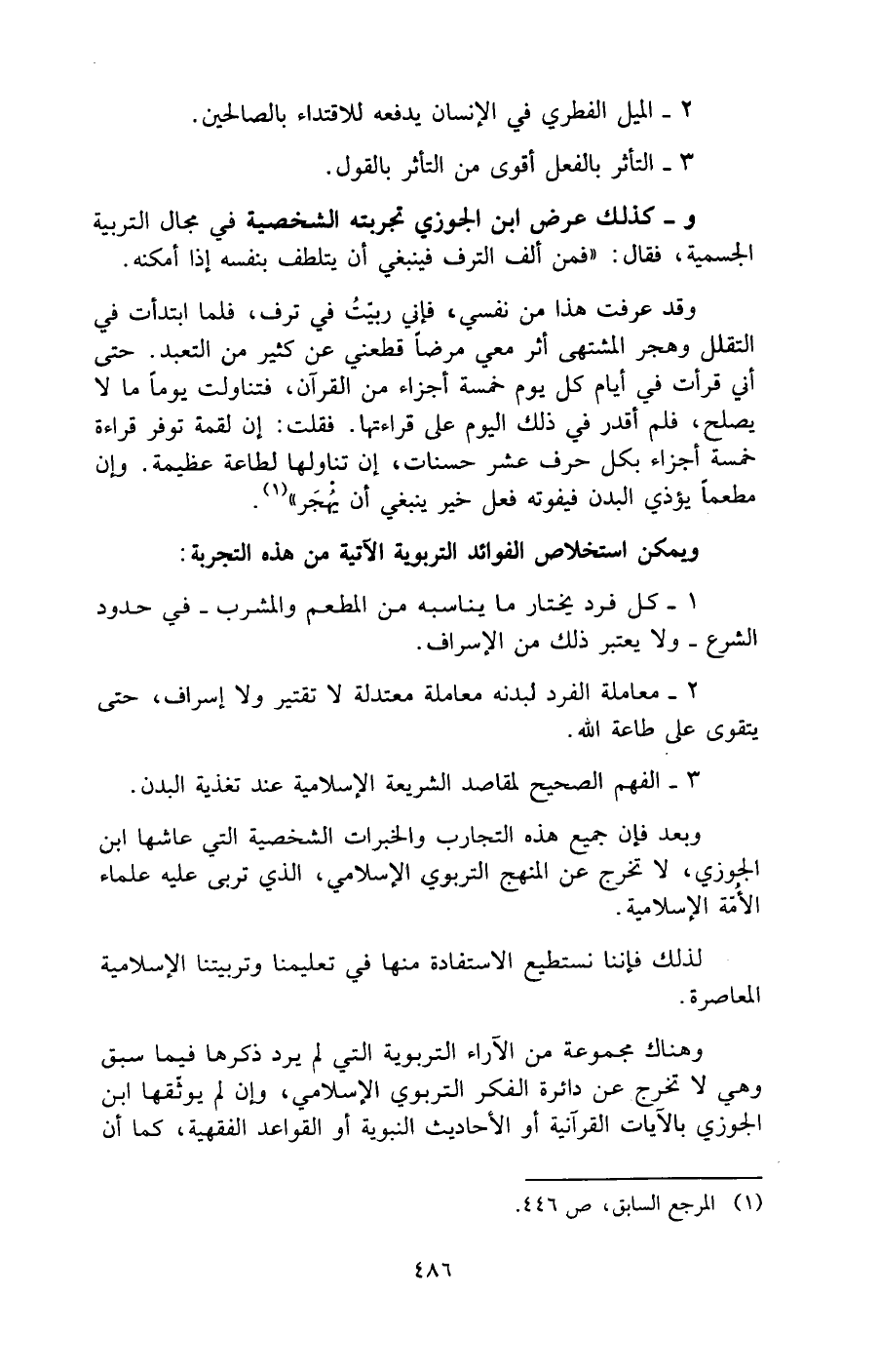 و- كذلك عرض ابن الجوزي تجربته الشخصية في مجال التربية الجسمية، فقال: "فمن ألف الترف فينبغي أن يتلطف بنفسه إذا أمكنه.