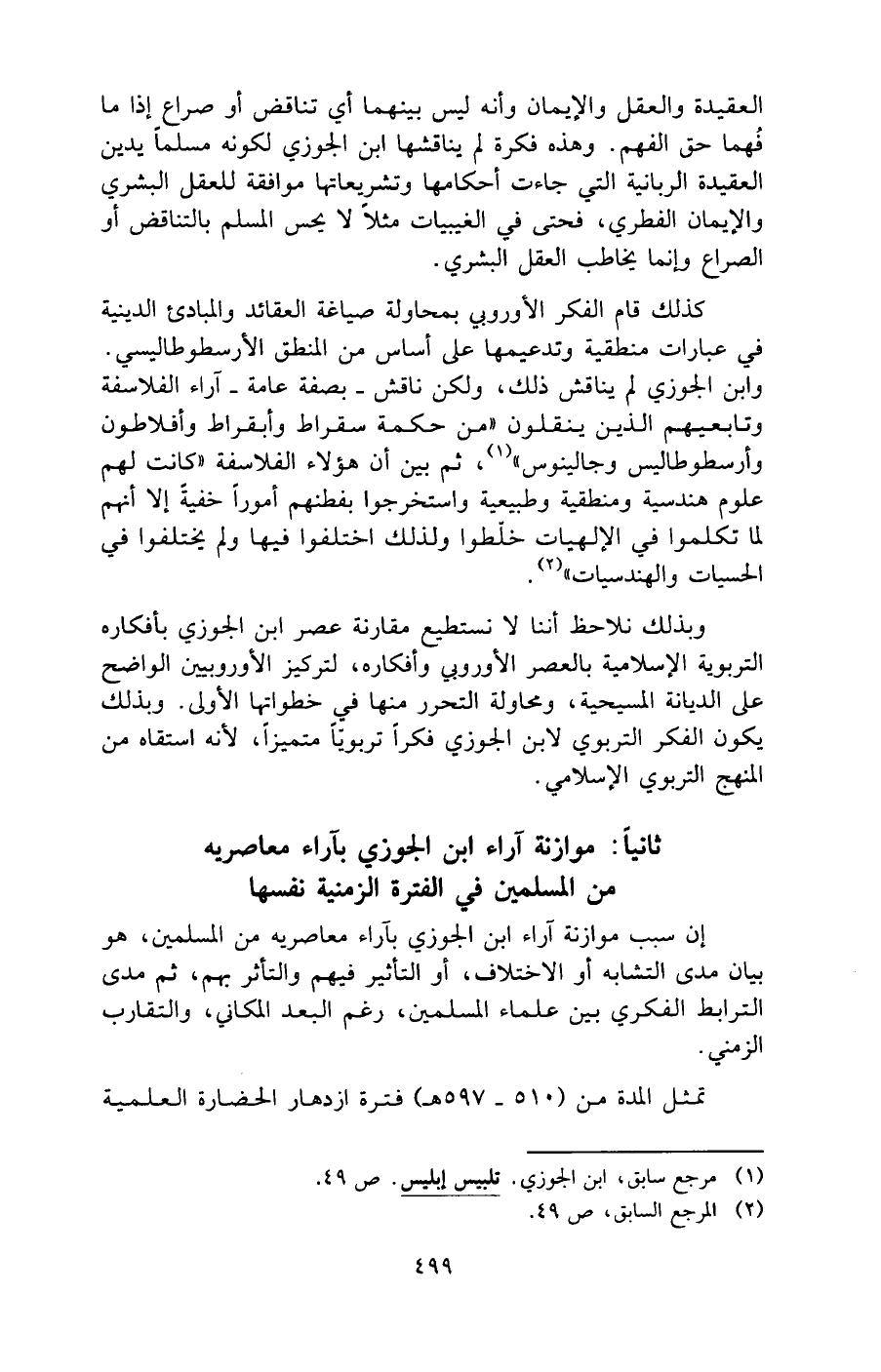 كذلك قام الفكر الأوروبي بمحاولة صياغة العقائد والمبادئ الدينية في عبارات منطقية وتدعيمها على أساس من المنطق الأرسطوطاليسي. وابن الجوزي لم يناقش ذلك، ولكن ناقش -بصفة عامة- آراء الفلاسفة وتابعيهم الذين ينقلون "من حكمة سقراط وأبقراط وأفلاطون وأرسطوطاليس وجالينوس" (¬1)، ثم بين أن هؤلاء الفلاسفة "كانت لهم علوم هندسية ومنطقية وطبيعية واستخرجوا بفطنهم أمورًا خفية إلا أنهم لما تكلموا في الإلهيات خلّطوا ولذلك اختلفوا فيها ولم يختلفوا في الحسيات والهندسيات" (¬2).