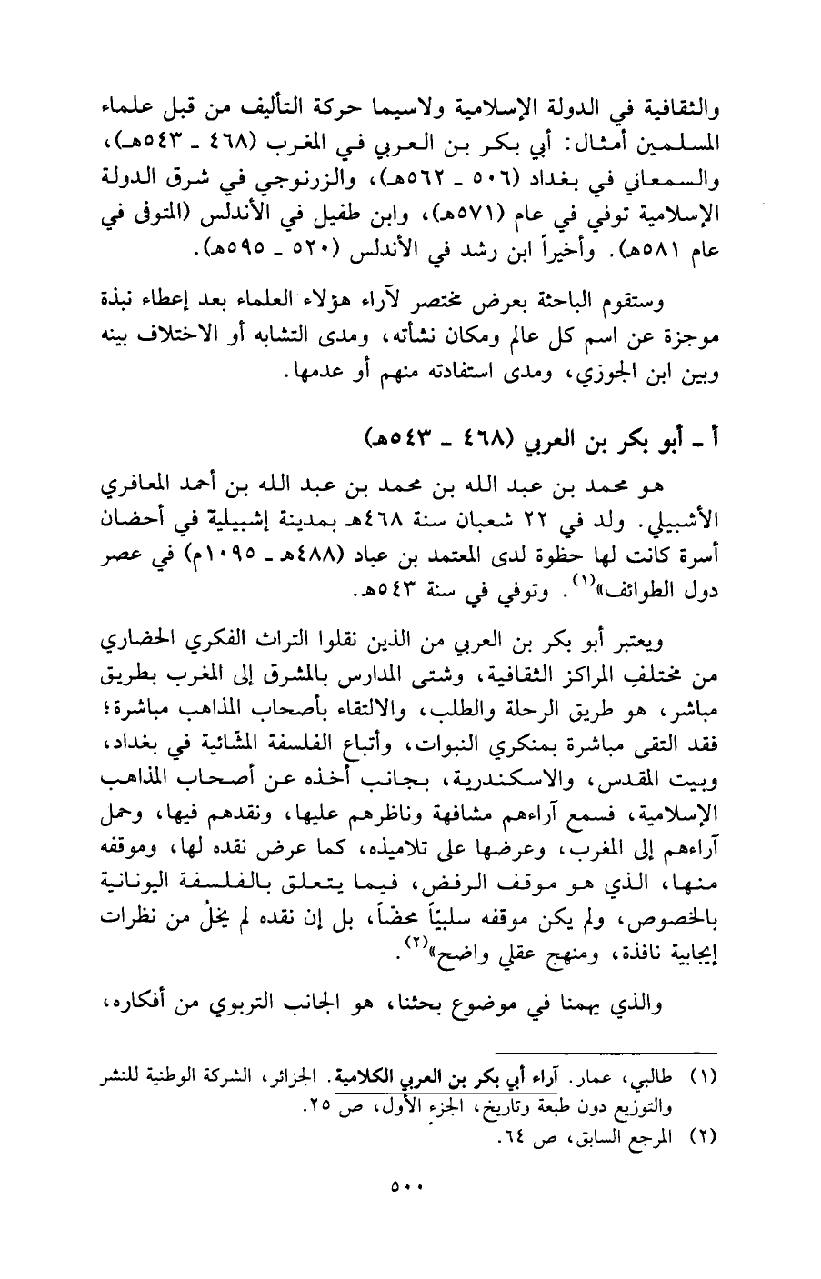 (¬1) طالبي، عمار. آراء أبي بكر بن العرب الكلامية. الجزائر، الشركة الوطنية للنشر والتوزيع دون طبعة وتاريخ، الجزء الأول، ص 25.