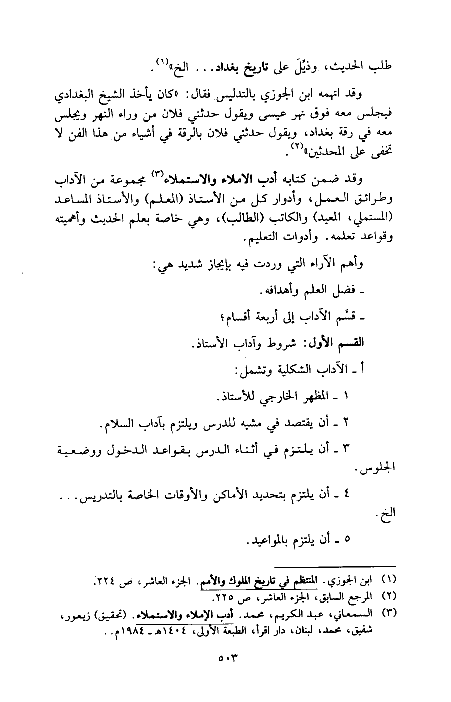 وقد ضمن كتابه أدب الاملاء والاستملاء (¬3) مجموعة من الآداب وطرائق العمل، وأدوار كل من الأستاذ (المعلم) والأستاذ المساعد (المستملي، المعيد) والكاتب (الطالب)، وهي خاصة بعلم الحديث وأهميته وقواعد تعلمه. وأدوات التعليم.