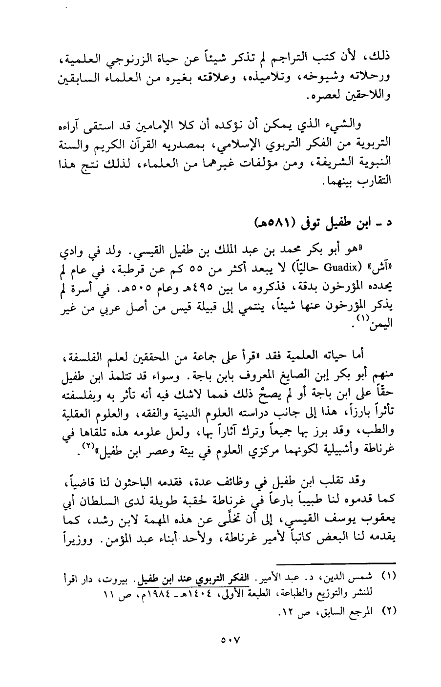(¬1) شمس الدين، د. عبد الأمير. الفكر التربوي عند ابن طفيل. بيروت، دار اقرأ للنشر والتوزيع والطباعة، الطبعة الأولى، 1404 هـ -1984 م، ص 11.