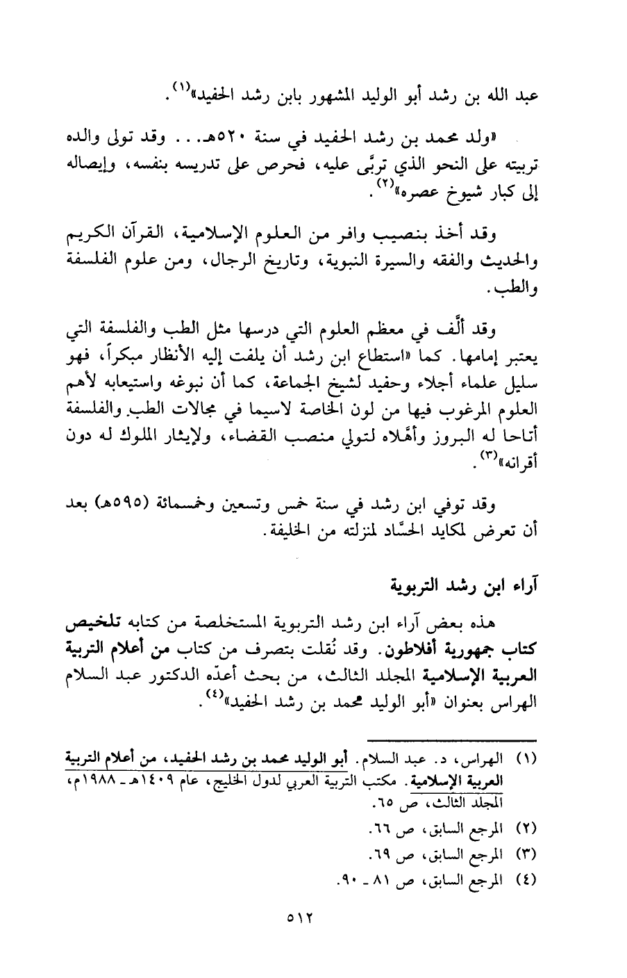 (¬1) الهراس، د. عبد السلام. أبو الوليد محمد بن رشد الحفيد، من أعلام التربية العربية الإسلامية. مكتب التربية العربي لدول الخليج، عام 1409 هـ-1988 م، المجلد الثالث، ص 65.