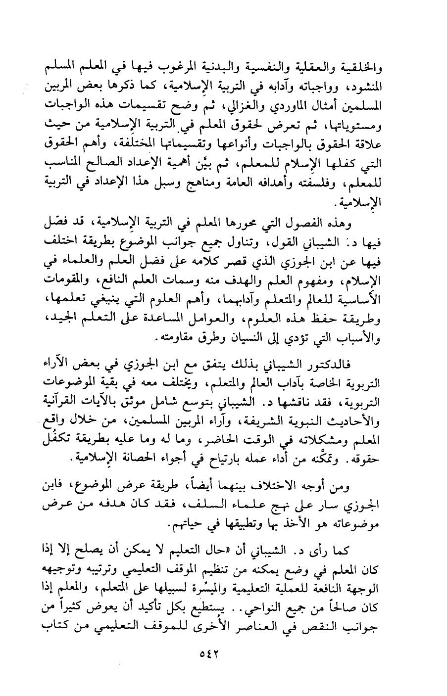 فالدكتور الشيباني بذلك يتفق مع ابن الجوزي في بعض الآراء التربوية الخاصة بآداب العالم والمتعلم، ويختلف معه في بقية الموضوعات التربوية، فقد ناقشها د. الشيباني بتوسع شامل موثق بالآيات القرآنية والأحاديث النبوية الشريفة، وآراء المربين المسلمين، من خلال واقع المعلم ومشكلاته في الوقت الحاضر، وما له وما عليه بطريقة تكفُل حقوقه. وتمكَّنه من أداء عمله بارتياح في أجواء الحصانة الإِسلامية.