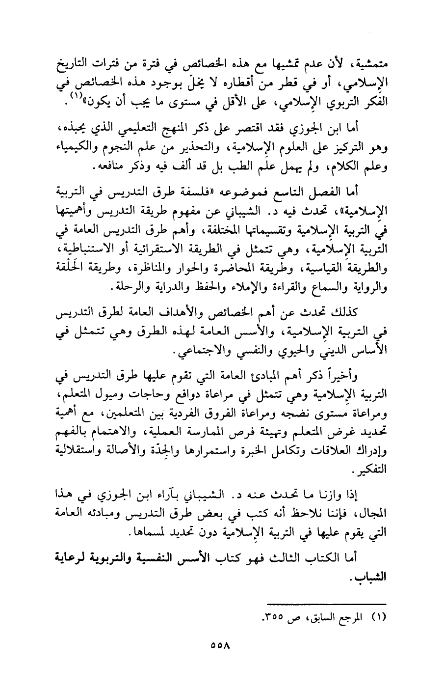 إذا وازنا ما تحدث عنه د. الشيباني بآراء ابن الجوزي في هذا المجال، فإننا نلاحظ أنه كتب في بعض طرق التدريس ومبادئه العامة التي يقوم عليها في التربية الإِسلامية دون تحديد لمسماها.