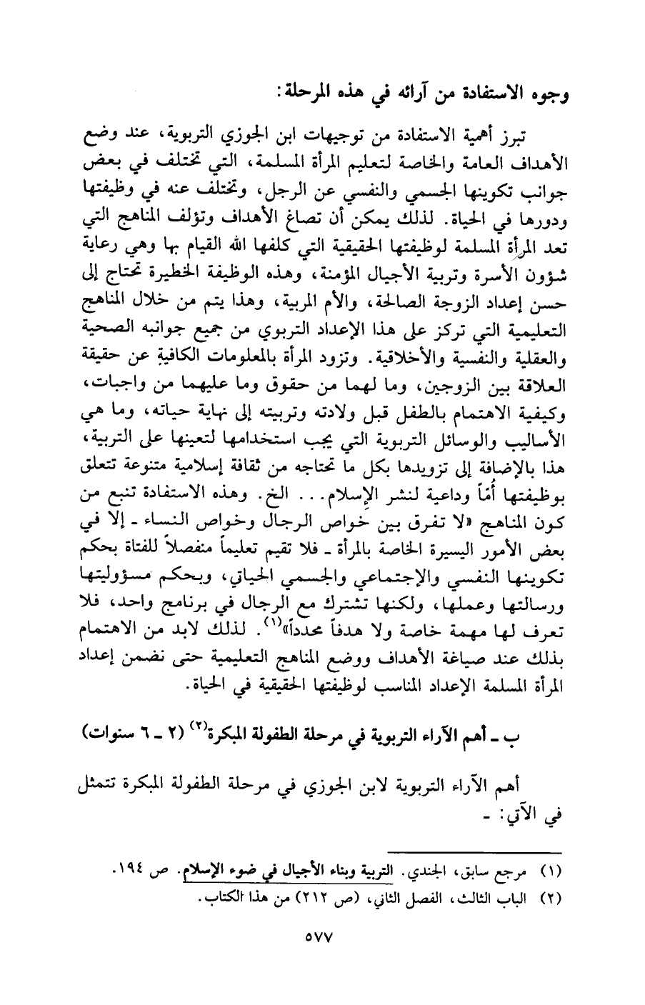 تبرز أهمية الاستفادة من توجيهات ابن الجوزي التربوية، عند وضع الأهداف العامة والخاصة لتعليم المرأة المسلمة، التي تختلف في بعض جوانب تكوينها الجسمي والنفسي عن الرجل، وتختلف عنه في وظيفتها ودورها في الحياة. لذلك يمكن أن تصاغ الأهداف وتؤلف المناهج التي تعد المرأة المسلمة لوظيفتها الحقيقية التي كلفها الله القيام بها وهي رعاية شؤون الأسرة وتربية الأجيال المؤمنة، وهذه الوظيفة الخطيرة تحتاج إلى حسن إعداد الزوجة الصالحة، والأم المربية، وهذا يتم من خلال المناهج التعليمية التي تركز على هذا الإعداد التربوي من جميع جوانبه الصحية والعقلية والنفسية والأخلاقية. وتزود المرأة بالمعلومات الكافية عن حقيقة العلاقة بين الزوجين، وما لهما من حقوق وما عليهما من واجبات، وكيفية الاهتمام بالطفل قبل ولادته وتربيته إلى نهاية حياته، وما هي الأساليب والوسائل التربوية التي يجب استخدامها لتعينها على التربية، هذا بالإضافة إلى تزويدها بكل ما تحتاجه من ثقافة إسلامية متنوعة تتعلق بوظيفتها أُمًّا وداعية لنشر الإسلام. . . الخ. وهذه الاستفادة تنبع من كون المناهج "لا تفرق بين خواص الرجال وخواص النساء -إلا في بعض الأمور اليسيرة الخاصة بالمرأة- فلا تقيم تعليمًا منفصلًا للفتاة بحكم تكوينها النفسي والإجتماعي والجسمي الحياتي، وبحكم مسؤوليتها ورسالتها وعملها، ولكنها تشترك مع الرجال في برنامج واحد، فلا تعرف لها مهمة خاصة ولا هدفًا محددًا" (¬1). لذلك لابد من الاهتمام بذلك عند صياغة الأهداف ووضع المناهج التعليمية حتى نضمن إعداد المرأة المسلمة الإعداد المناسب لوظيفتها الحقيقية في الحياة.