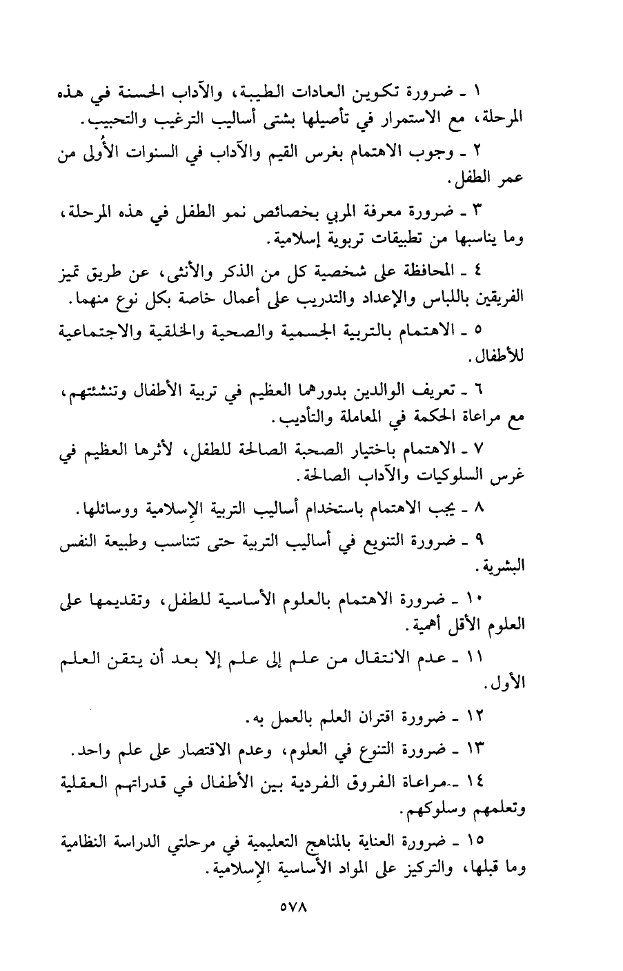15 - ضرورة العناية بالمناهج التعليمية في مرحلتي الدراسة النظامية وما قبلها، والتركيز على المواد الأساسية الإِسلامية.
