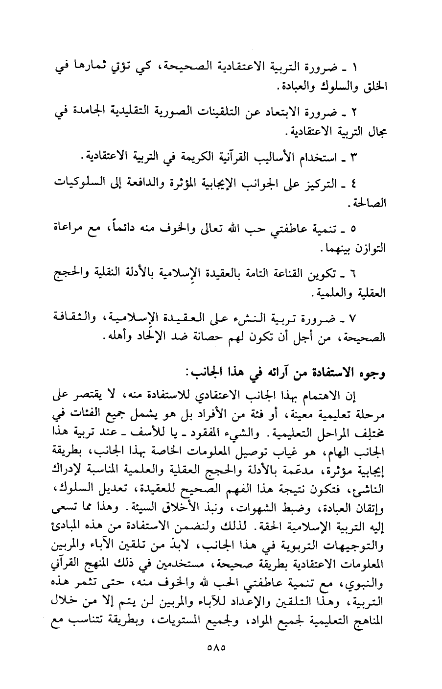 إن الاهتمام بهذا الجانب الاعتقادي للاستفادة منه، لا يقتصر على مرحلة تعليمية معينة، أو فئة من الأفراد بل هو يشمل جميع الفئات في مختلف المراحل التعليمية. والشيء المفقود -يا للأسف- عند تربية هذا الجانب الهام، هو غياب توصيل المعلومات الخاصة بهذا الجانب، بطريقة إيجابية مؤثرة، مدعّمة بالأدلة والحجج العقلية والعلمية المناسبة لإدراك الناشئ، فتكون نتيجة هذا الفهم الصحيح للعقيدة، تعديل السلوك، وإتقان العبادة، وضبط الشهوات، ونبذ الأخلاق السيئة. وهذا مما تسعى إليه التربية الإسلامية الحقة. لذلك ولنضمن الاستفادة من هذه المبادئ والتوجيهات التربوية في هذا الجانب، لابدّ من تلقين الآباء والمربين المعلومات الاعتقادية بطريقة صحيحة، مستخدمين في ذلك المنهج القرآني والنبوي، مع تنمية عاطفتي الحب لله والخوف منه، حتى تثمر هذه التربية، وهذا التلقين والإعداد للآباء والمربين لن يتم إلا من خلال المناهج التعليمية لجميع المواد، ولجميع المستويات، وبطريقة تتناسب مع