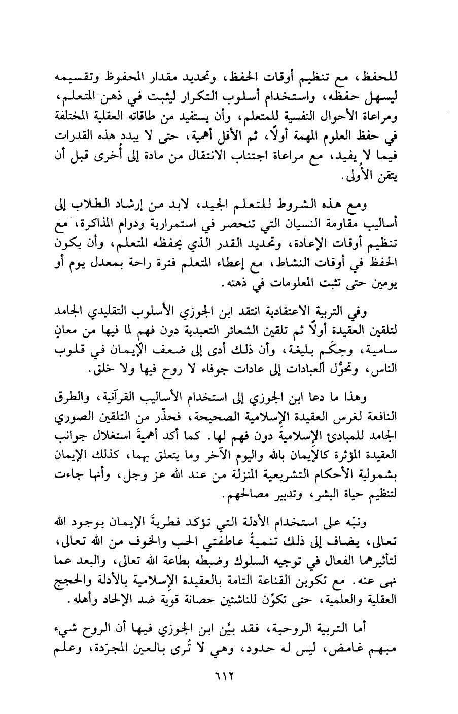 وهذا ما دعا ابن الجوزي إلى استخدام الأساليب القرآنية، والطرق النافعة لغرس العقيدة الإسلامية الصحيحة، فحذّر من التلقين الصوري الجامد للمبادئ الإِسلاميةَ دون فهم لها. كما أكد أهميةَ استغلال جوانب العقيدة المؤثرة كالإيمان بالله واليوم الآخر وما يتعلق بهما، كذلك الإيمان بشمولية الأحكام التشريعية المنزلة من عند الله -عز وجل-، وأنها جاءت لتنظيم حياة البشر، وتدبير مصالحهم.