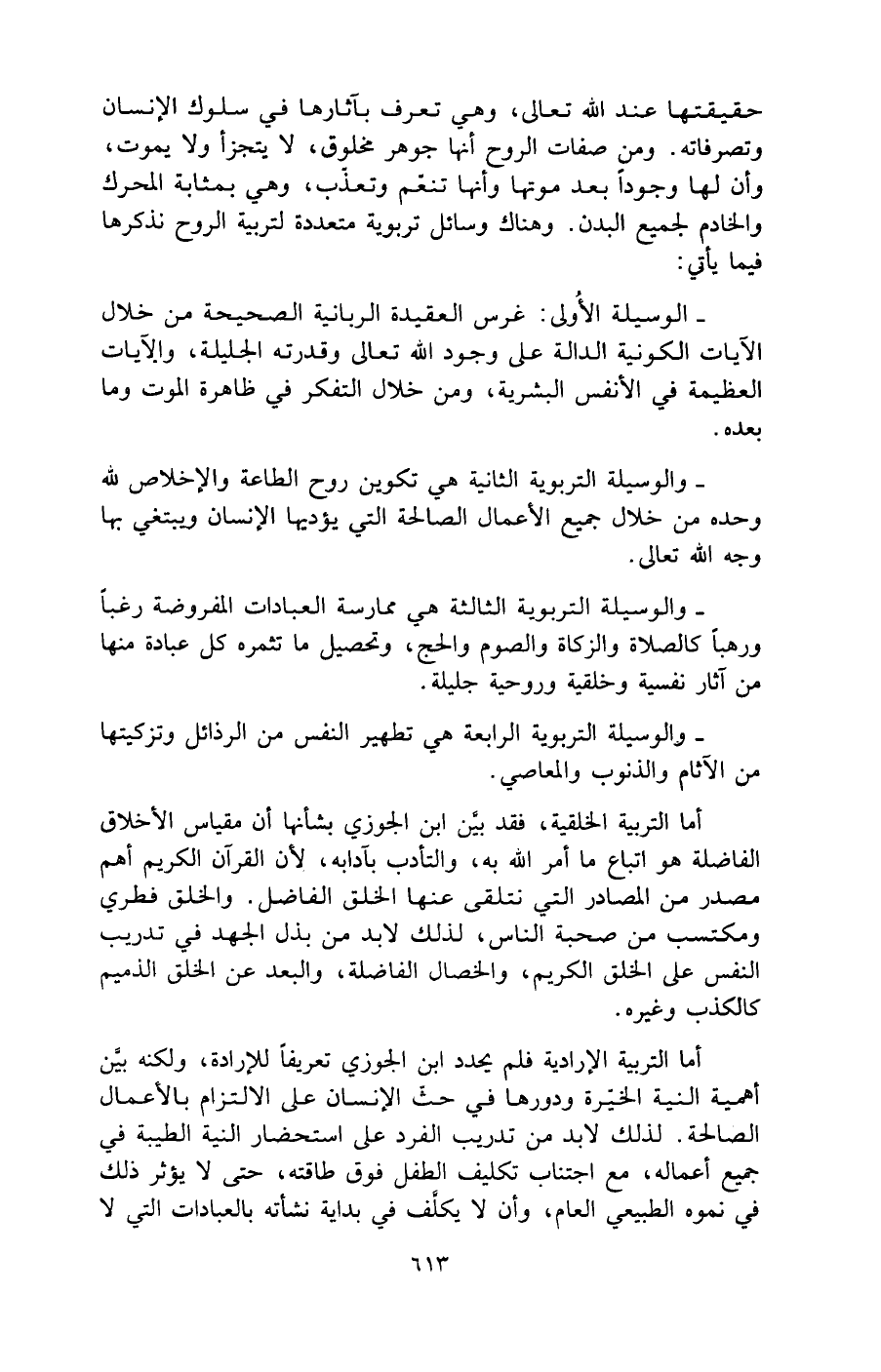 حقيقتها عند الله تعالى، وهي تعرف بآثارها في سلوك الإنسان وتصرفاته. ومن صفات الروح أنها جوهر مخلوق، لا يتجزأ ولا يموت، وأن لها وجودًا بعد موتها وأنها تنعّم وتعذّب، وهي بمثابة المحرك والخادم لجميع البدن. وهناك وسائل تربوية متعددة لتربية الروح نذكرها فيما يأتي:
