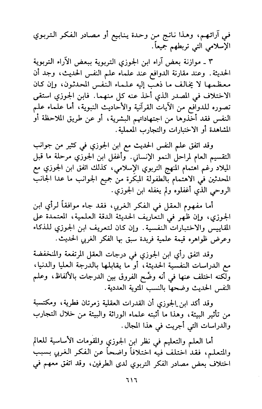 3 - موازنة بعض آراء ابن الجوزي التربوية ببعض الآراء التربوية الحديثة. وعند مقارنة الدوافع عند علماء علم النفس الحديث، وجد أن معظمها لا يخالف ما ذهب إليه علماء النفس المحدثون، وإن كان الاختلاف في المصدر الذي أخذ عنه كل منهما. فابن الجوزي استقى تصوره للدوافع من الآيات القرآنية والأحاديث النبوية، أما علماء علم النفس فقد أخذوها من اجتهاداتهم البشرية، أو عن طريق الملاحظة أو المشاهدة أو الاختبارات والتجارب المعملية.