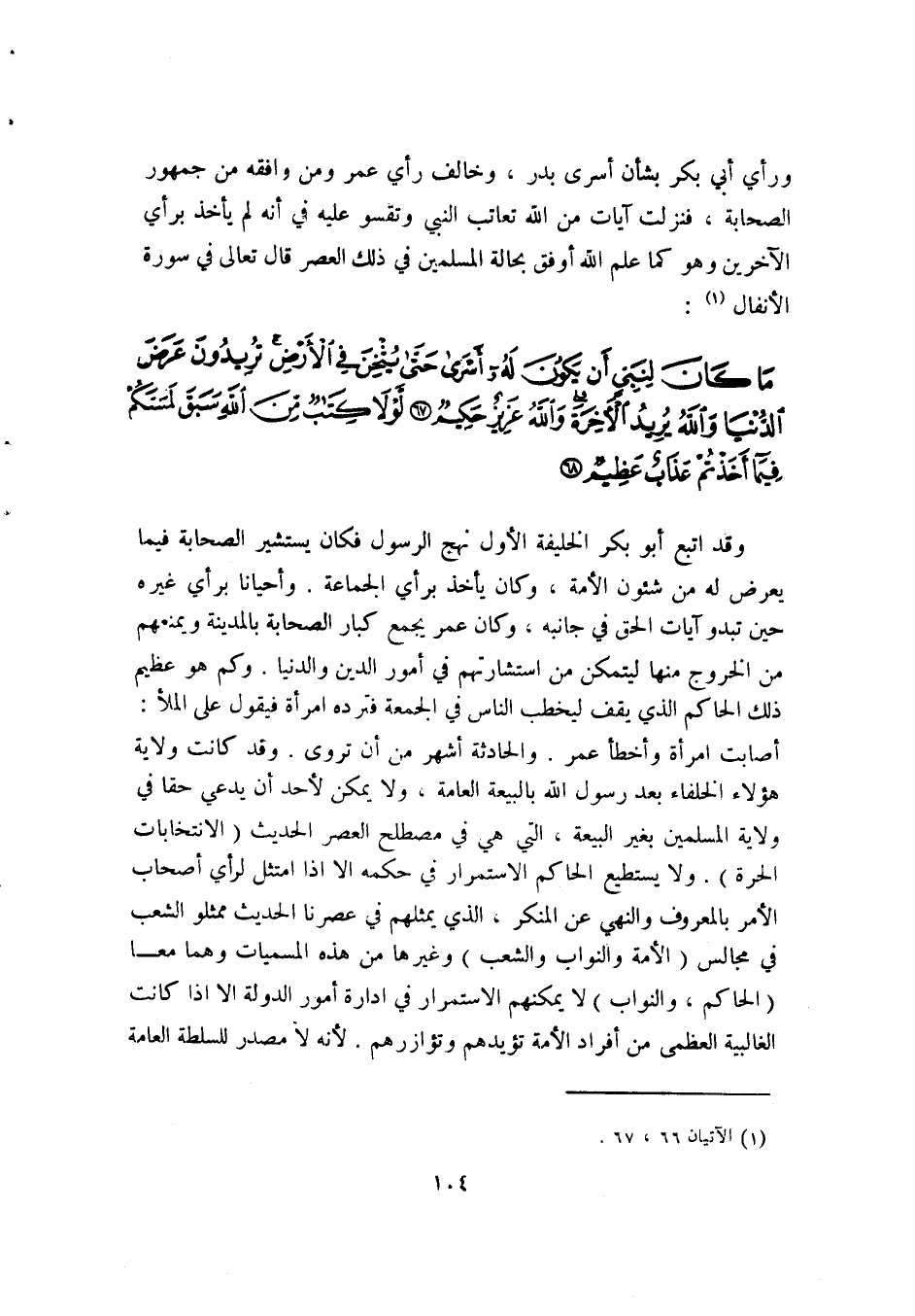 وقد اتبع أبو بكر الخليفة الأول نهج الرسول فكان يستشير الصحابة فيما يعرض له من شئون الأمة، وكان يأخذ برأي الجماعة. وأحيانا برأي غيره حين تبدو آيات الحق في جانبه، وكان عمر يجمع كبار الصحابة بالمدينة ويمنعهم من الخروج منها ليتمكن من استشارتهم في أمور الدين والدنيا. وكم هو عظيم ذلك الحاكم الذي يقف ليخطب الناس في الجمعة فترده امرأة فيقول على الملأ: أصابت امرأة وأخطا عمر. والحادثة أشهر من أن تروى. وقد كانت ولاية هؤلاء الخلفاء بعد رسول الله بالبيعة العامة، ولا يمكن لأحد أن يدعي حقا في ولاية المسلمين بغير البيعة، التي هي في مصطلح العصر الحديث "الانتخابات الحرة". ولا يستطيع الحاكم الاستمرار في حكمه إلا إذا امتثل لرأي أصحاب الأمر بالمعروف والنهي عن المنكر، الذي يمثلهم في عصرنا الحديث ممثلو الشعب في مجالس "الأمة والنواب والشعب" وغيرها من هذه المسميات وهما معا "الحاكم، والنواب" لا يمكنهم الاستمرار في إدارة أمور الدولة إلا إذا كانت الغالبية العظمى من أفراد الأمة تؤيدهم وتؤازرهم؛ لأنه لا مصدر للسلطة العامة