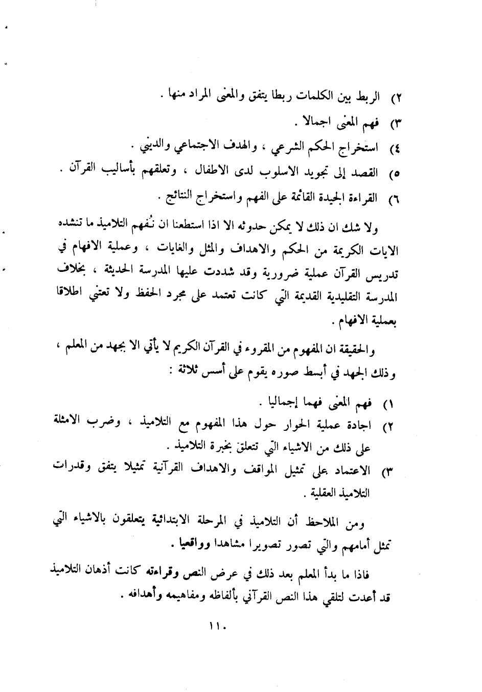 ولا شك أن ذلك لا يمكن حدوثه إلا إذا استطعنا أن نفهم التلاميذ ما تنشده الآيات الكريمة من الحكم والأهداف والمثل والغايات، وعملية الإفهام في تدريس القرآن عملية ضرورية وقد شددت عليها المدرسة الحديثة، بخلاف المدرسة التقليدية القديمة التي كانت تعتمد على مجرد الحفظ ولا تعتني إطلاقا بعملية الإفهام.